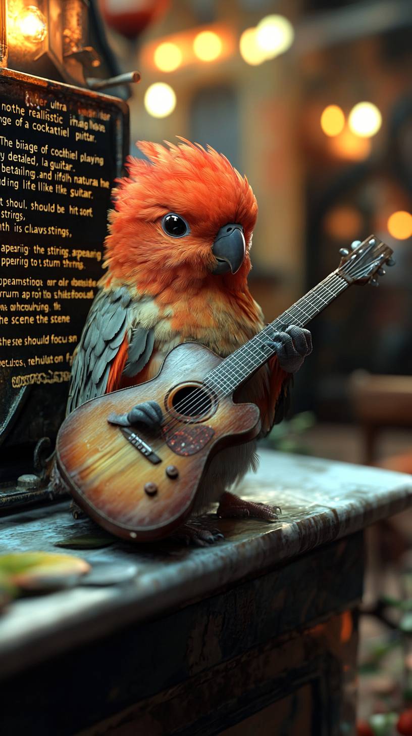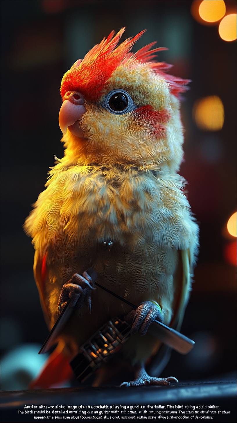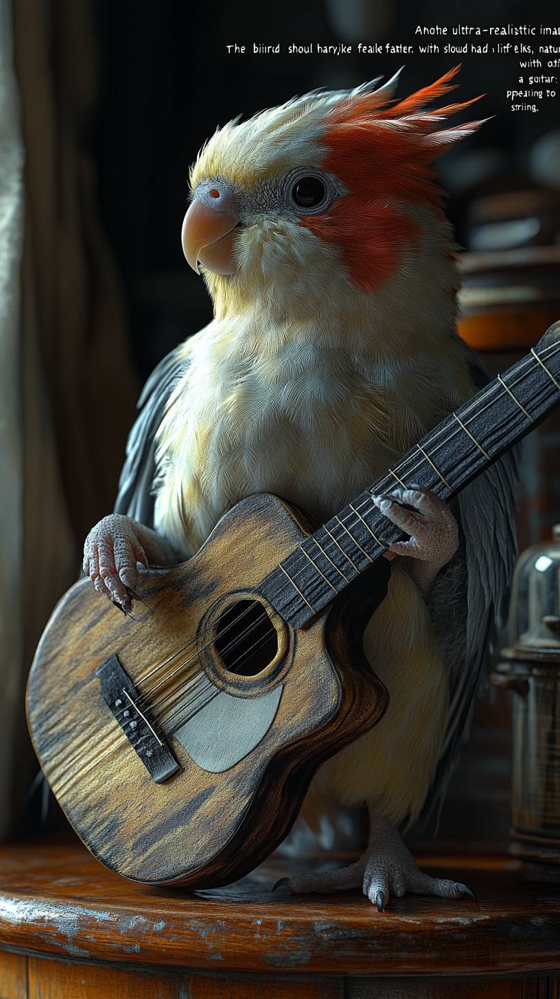 "Another ultra-realistic image of a cockatiel playing a guitar. The bird should have very detailed, lifelike feathers with soft, natural coloring, and it should be holding a guitar with its claws, appearing to strum the strings. The scene should focus on realism, with accurate textures and lighting, featuring a simple and neutral background to emphasize the bird and the guitar." --ar 9:16 --stylize 750 --v 6.1