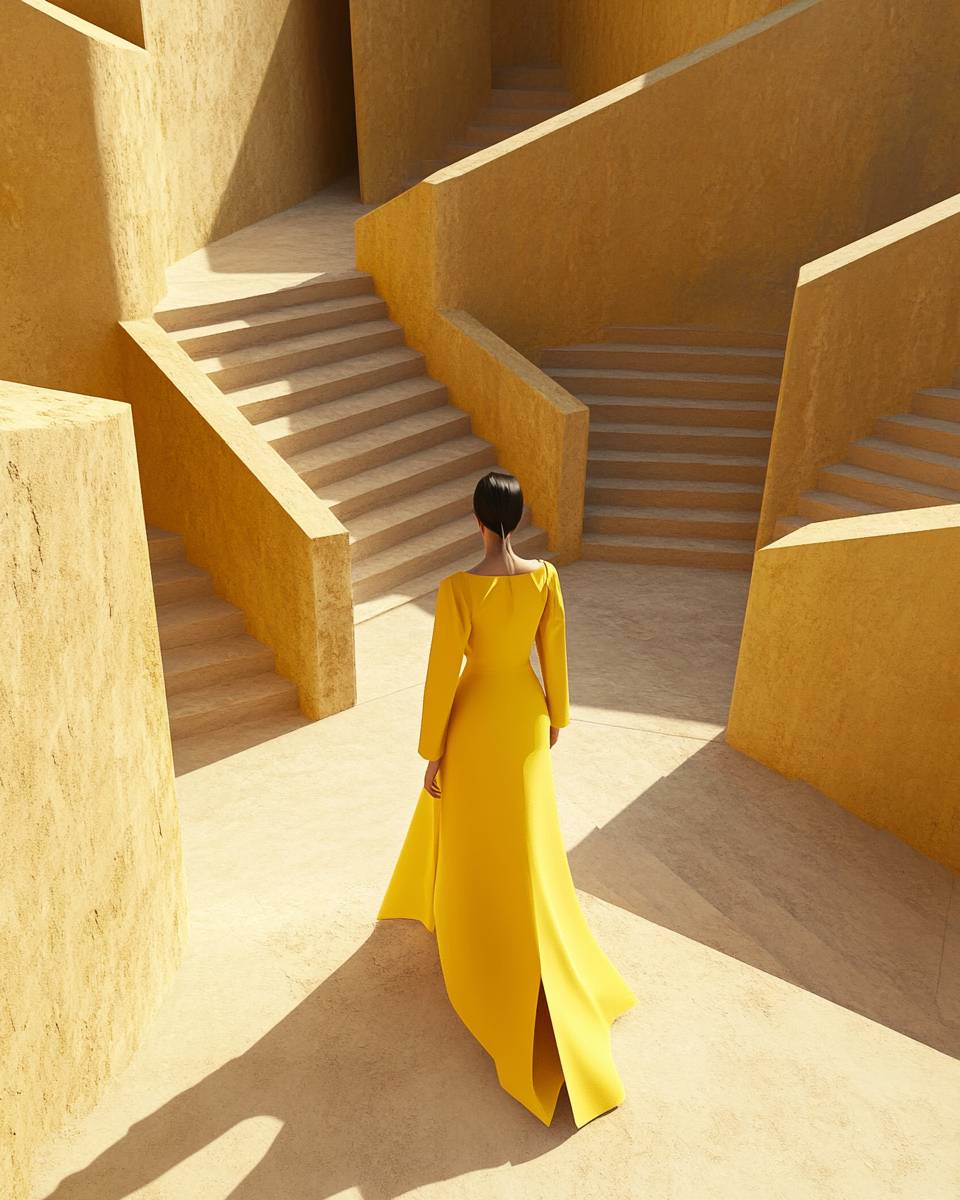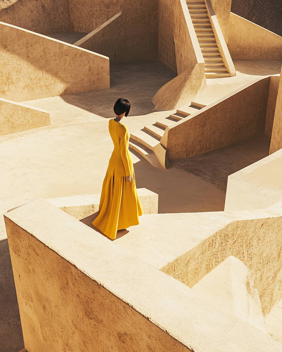 fashion editorial , 1 female model in sharp yellow outfits ,waist above shot , wide angle , low wide angle , multiple stairways in the desert , minimalism , photorealistic , escher stairs , Escher ideas , escher stairs, mc escher , penrose stairs , 8K quality, high quality, --ar 4:5 --v 6.1