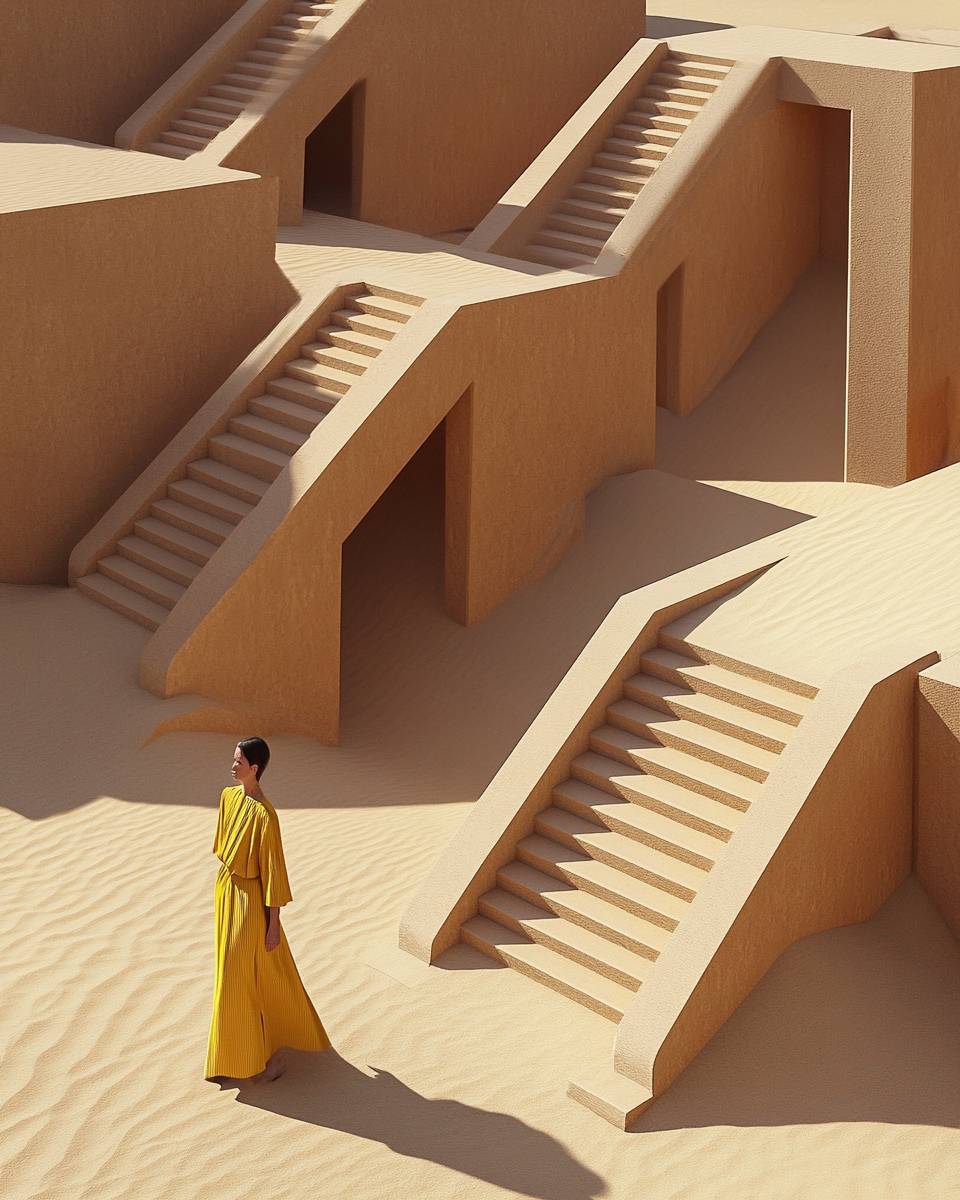 Mode-Editorial, 1 weibliches Modell in scharfen gelben Outfits, Hüfthöhe Aufnahme, Weitwinkel, niedriger Weitwinkel, mehrere Treppen im Wüstensand, Minimalismus, photorealistisch, Escher-Treppen, Escher-Ideen, M.C. Escher, Penrose Treppen, 8K Qualität, hohe Qualität