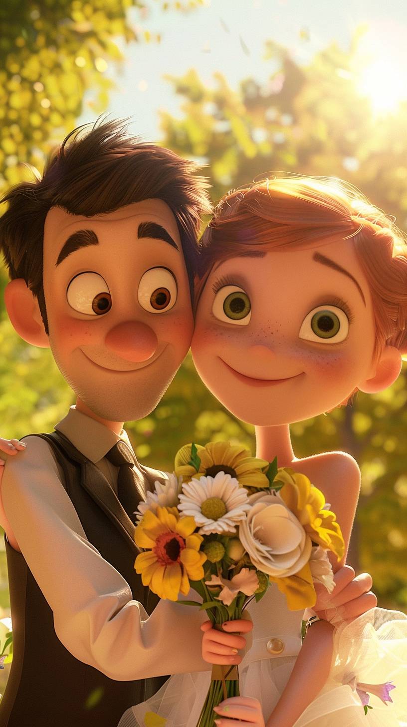 Summer, couple, hugging, bouquet, romantic atmosphere, smile, looking at the camera, animation scene, bright sunshine, park background, DreamWorks, Pixar --ar 9:16 --v 6.0
