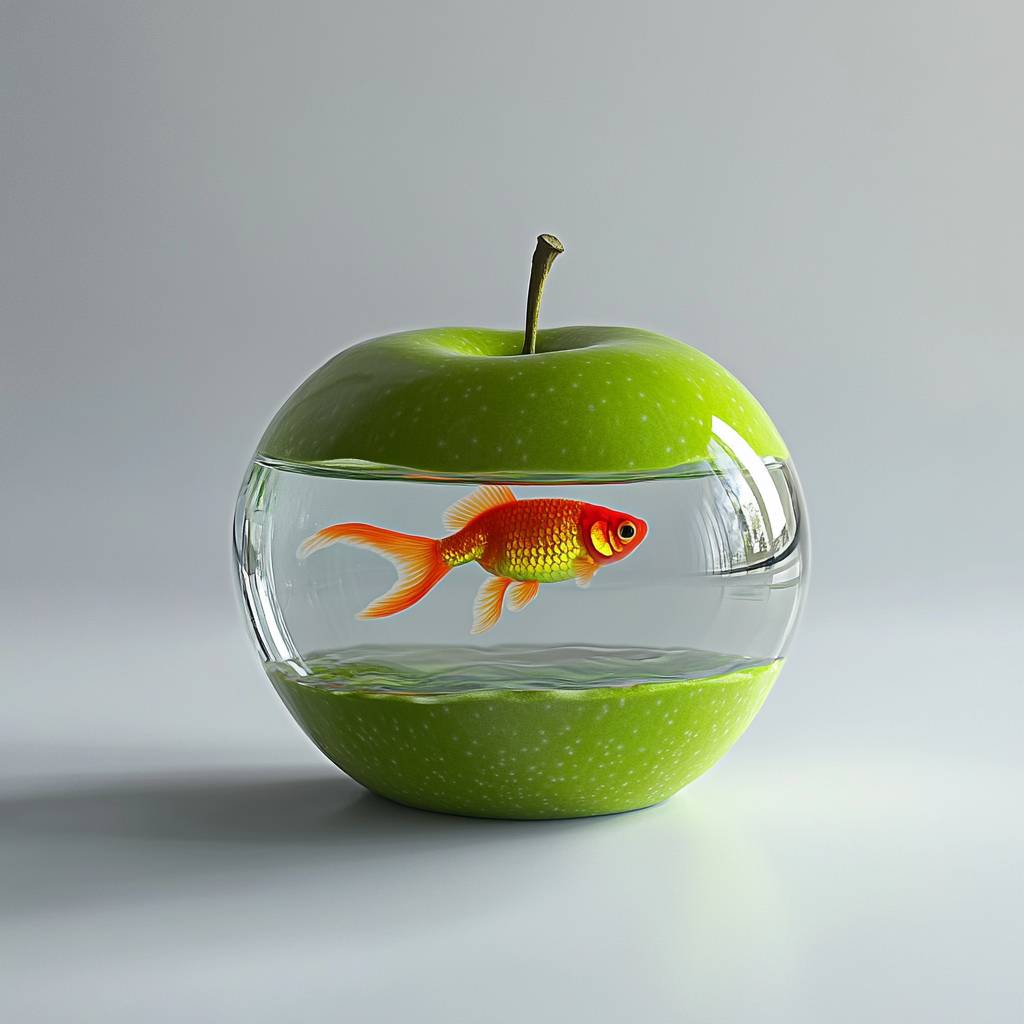 Auf dem Bürotisch liegt ein grüner Apfel. Das untere Drittel des Apfels ist normal, die oberen zwei Drittel sind transparent mit einer äußeren Kontur. Die Verbindung zwischen dem unteren Drittel und den oberen zwei Dritteln kann als Schnittfläche des Apfels gesehen werden. Im mittleren Drittel befindet sich Wasser mit einem kleinen roten Goldfisch darin, zart, traumhaft und lebendig, 8K Ultra HD Bild 2.0 Pro 9:16.