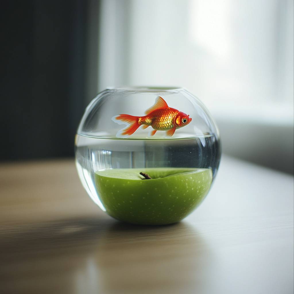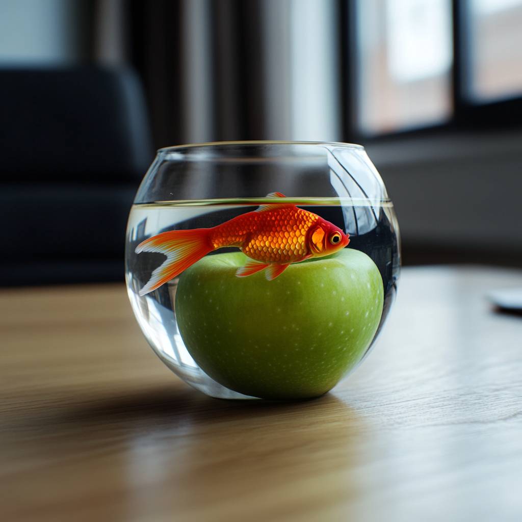 Auf dem Schreibtisch liegt ein transparentes Apfel mit einem kleinen Goldfisch darin.