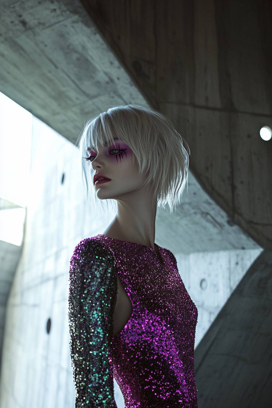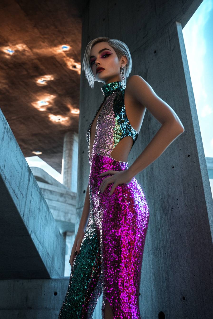 Ein atemberaubendes Vogue-Goth-Modell steht in einem futuristischen modernen Betonhauses, mit einer Galaxie im Hintergrund, trägt ein rosa, grünes und lila diamantbesetztes Pailletten-Kleid von Dolce & Gabbana, kurze Haare, halb blond, halb dunkel, hyperrealistisch, 4K-Auflösung, Tiefenschärfe.