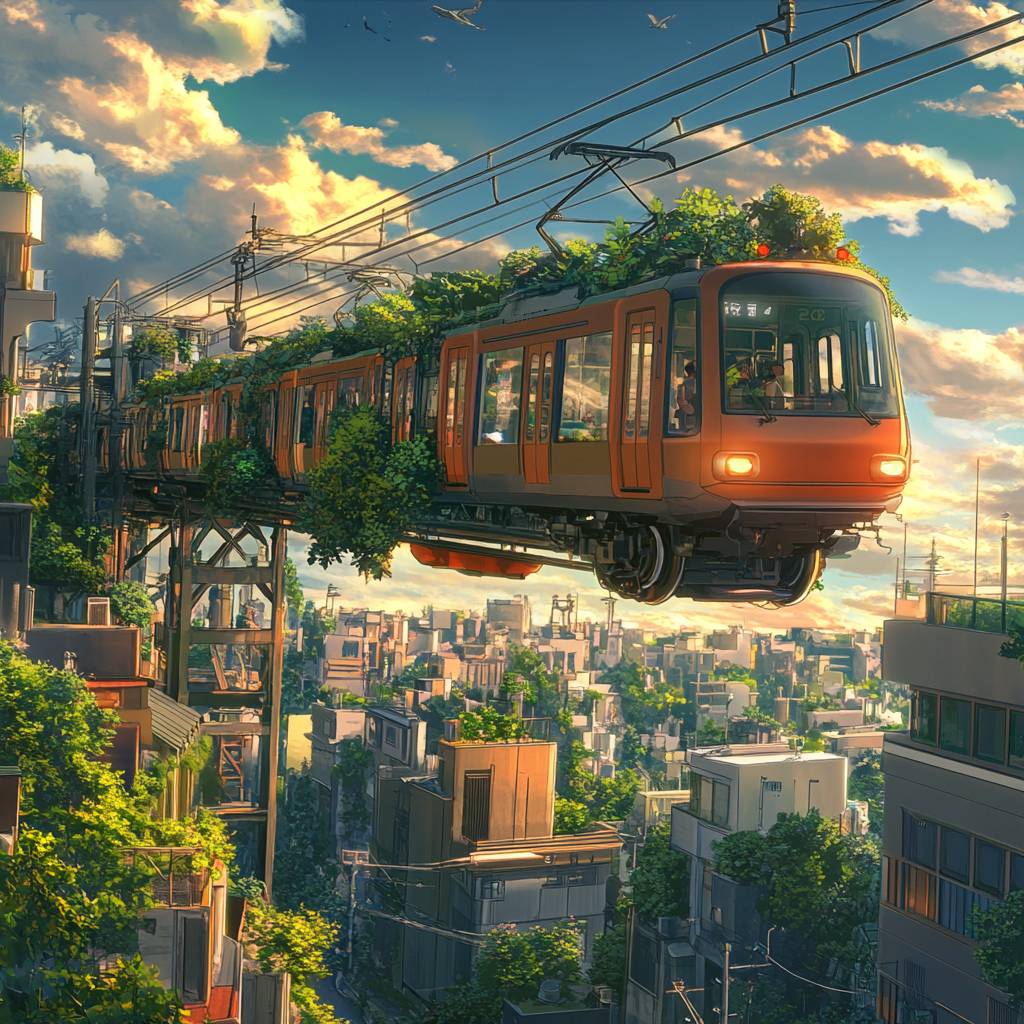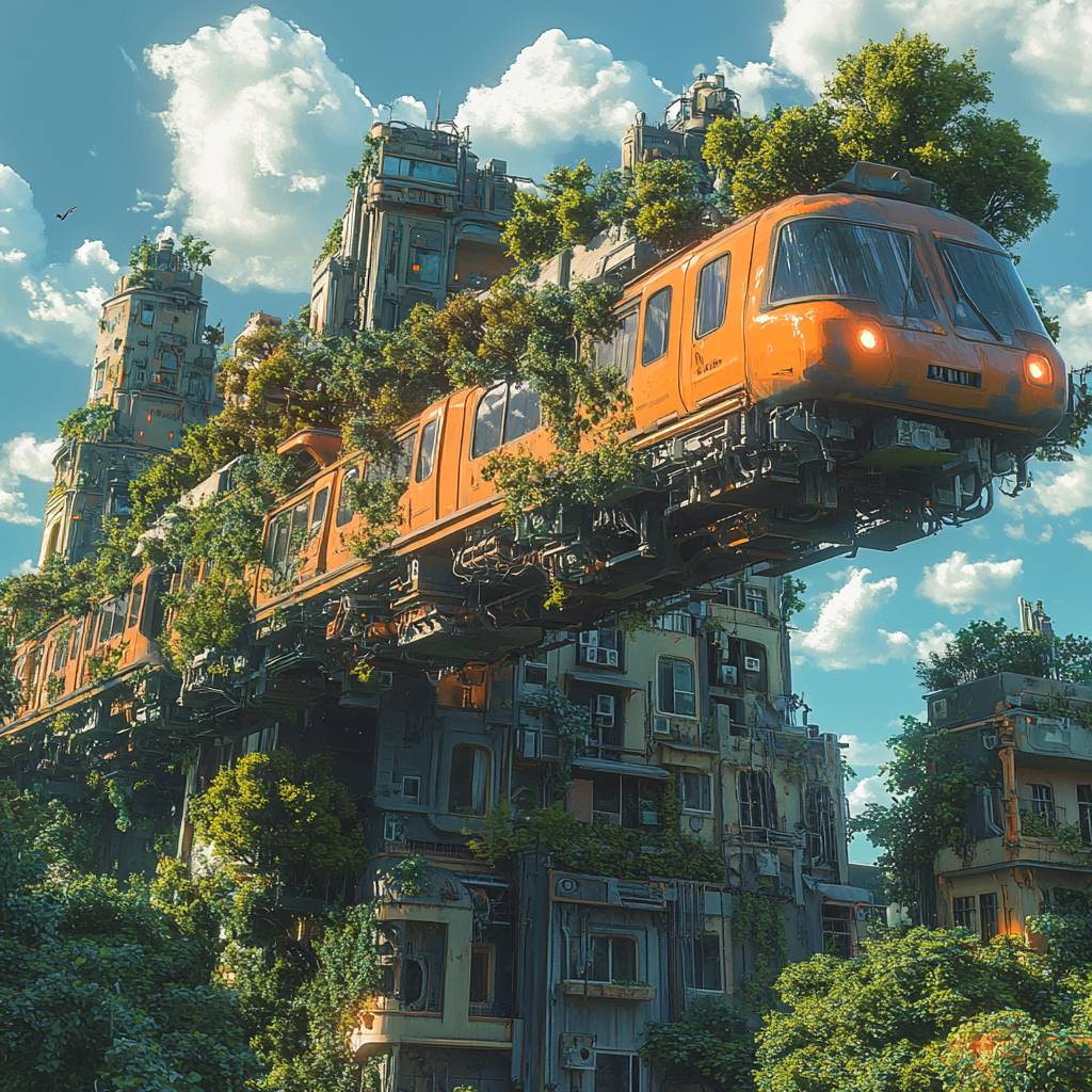 This is a futuristic aerial city, a train flying in the sky, no rails, a lot of plants on the train, ultra-high definition, Hayao Miyazaki style, ultra-realistic, ultra-high details, fresh and healing style, rich plant details, Beautiful colors, bright light, regular lines, surreal composition, large upward angle, warm light, early morning light, rich blue sky - ar 1:1 --v 6.1