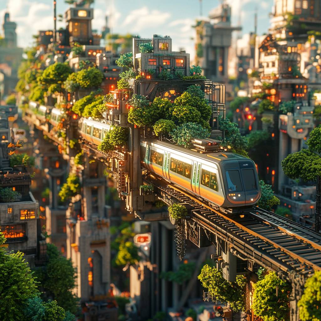 Dies ist eine futuristische Luftstadt mit einem Zug, der am Himmel fliegt, ohne Schienen, gefüllt mit Pflanzen, ultra-hoher Auflösung und schönen Farben.