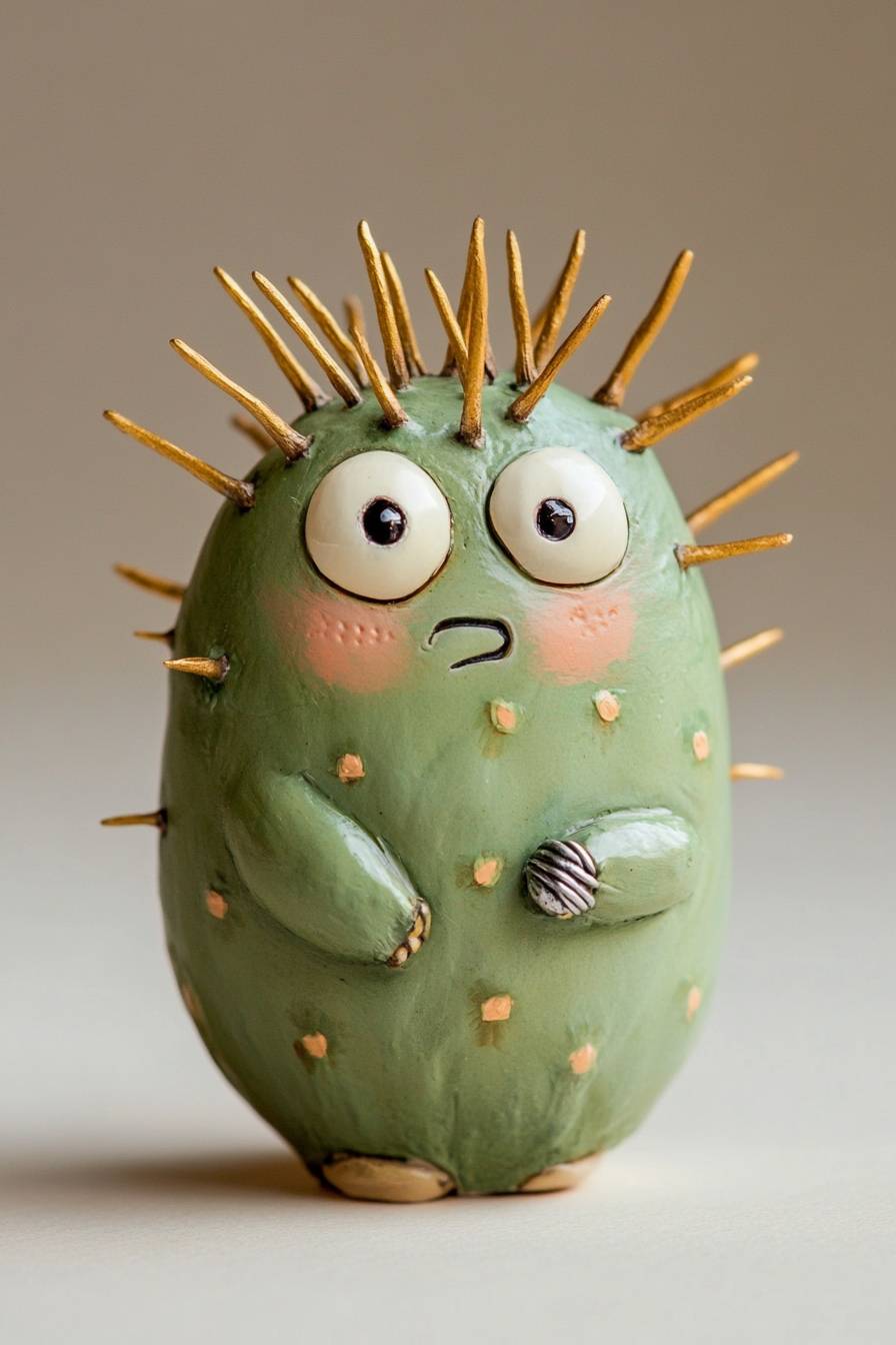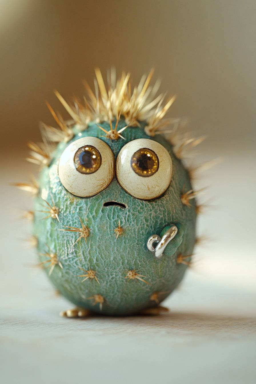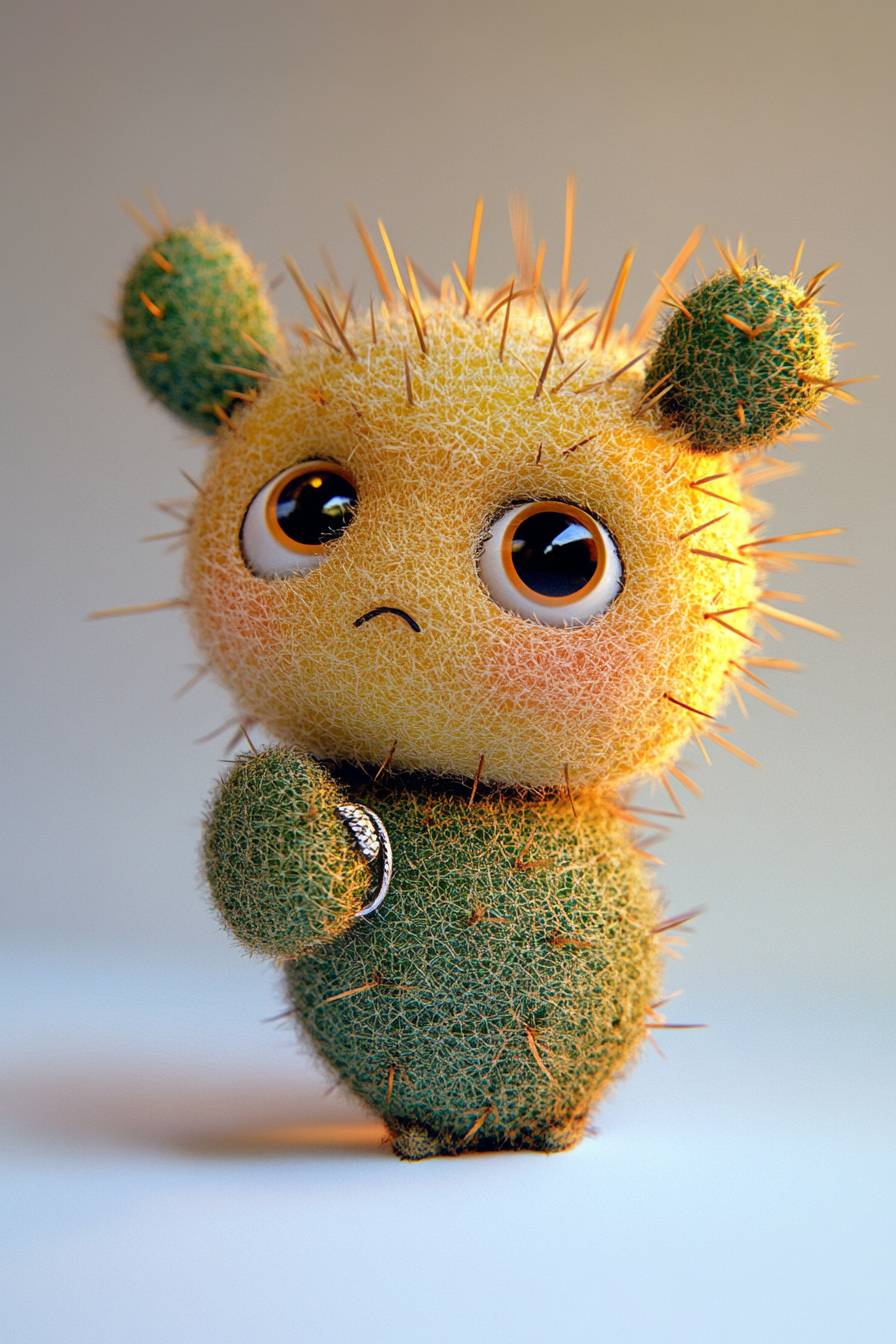 endearing miniature cactus being, plump, rounded body with golden prickles and large, expressive eyes, perplexed expression, thorny, stout, winsome, the cactus being is wearing a minuscule silver ring on one of its spines, swaying slightly side to side, cute and adorable, simple eggshell white backdrop, warm butterscotch colored key light with soft fill --v 6.1 --ar 2:3