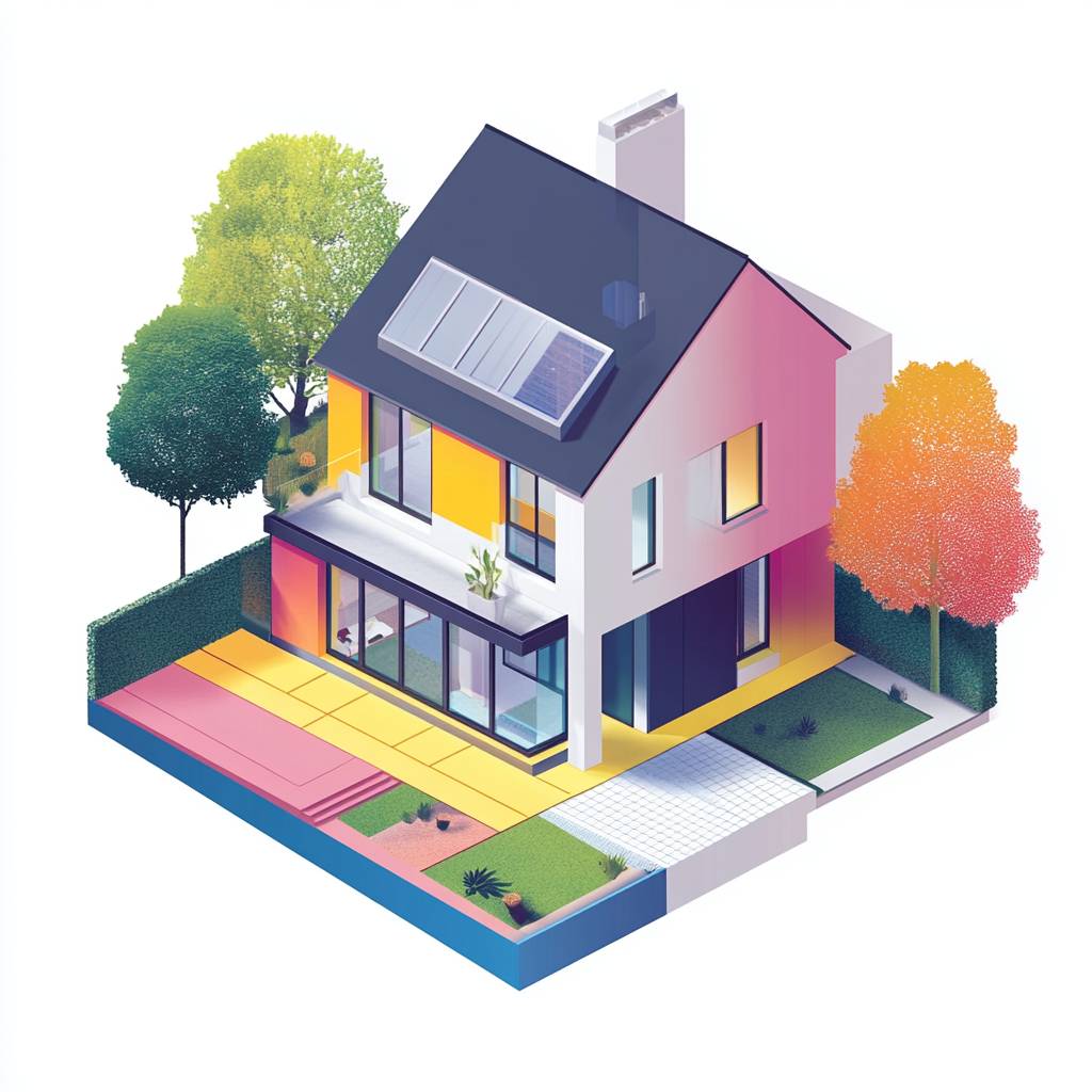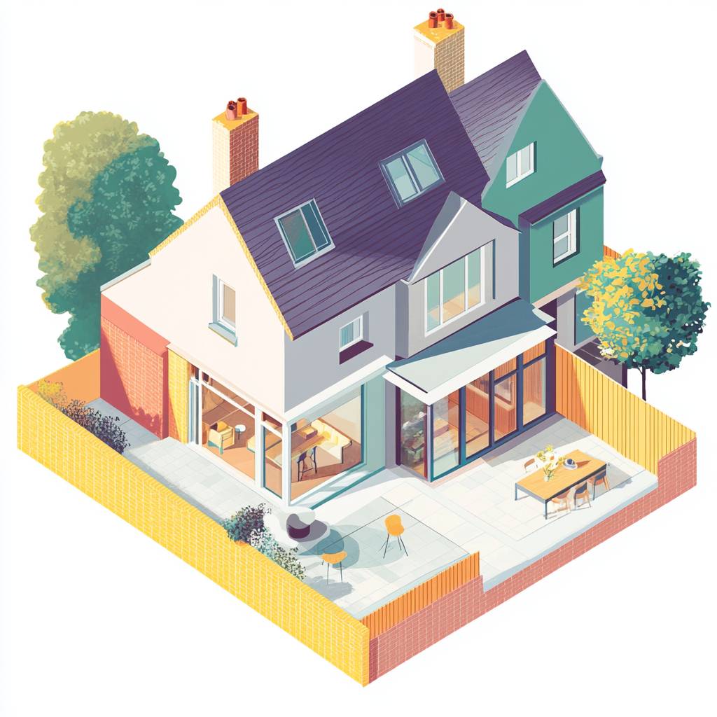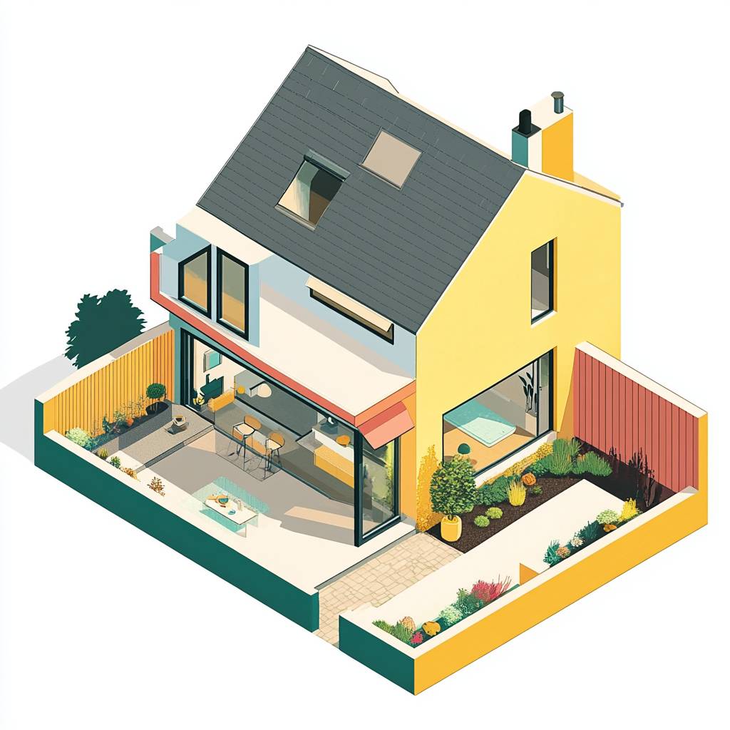 Eine farbenfrohe Infografik über einen einzeiligen Anbau an ein Haus, 8 Meter lang.