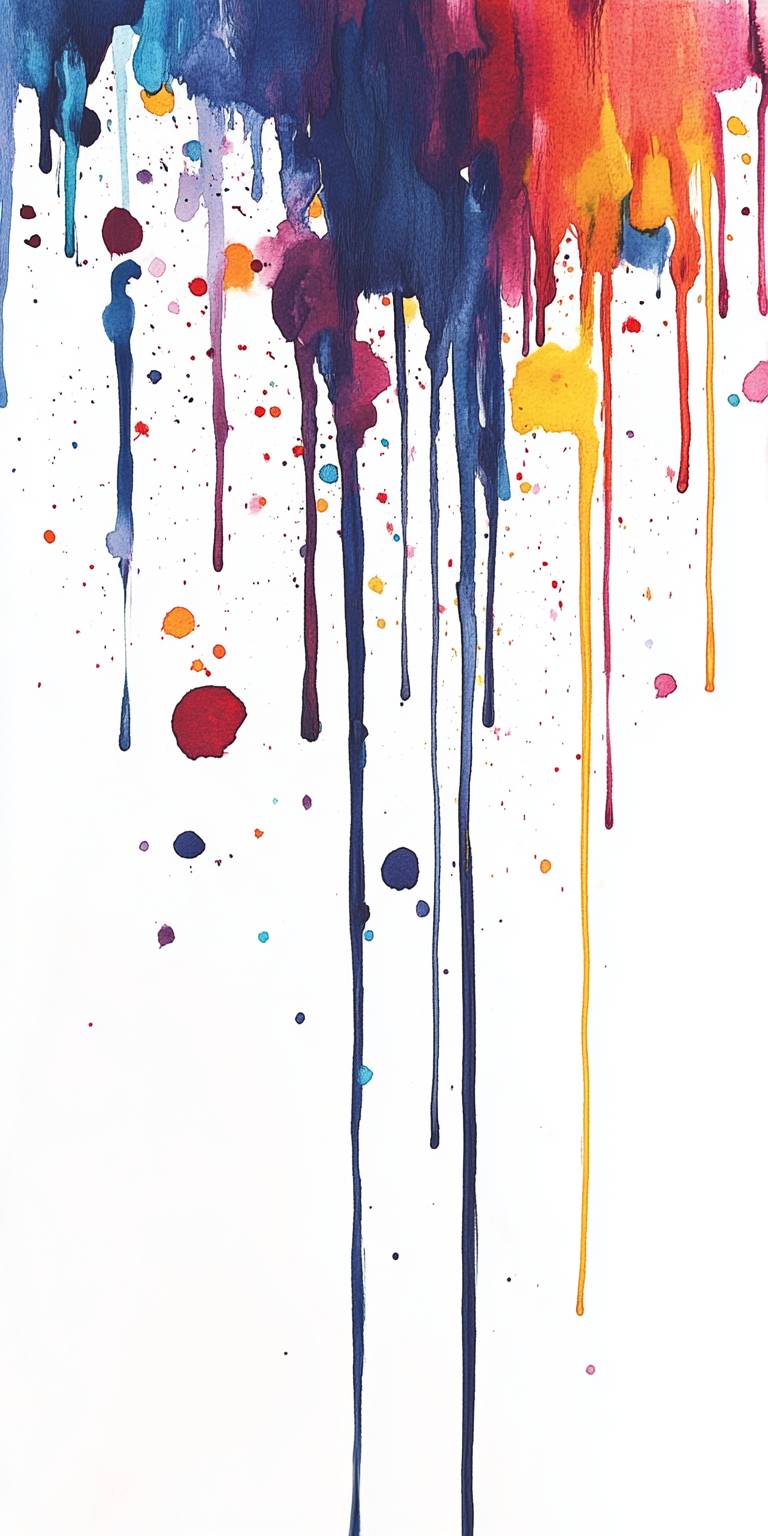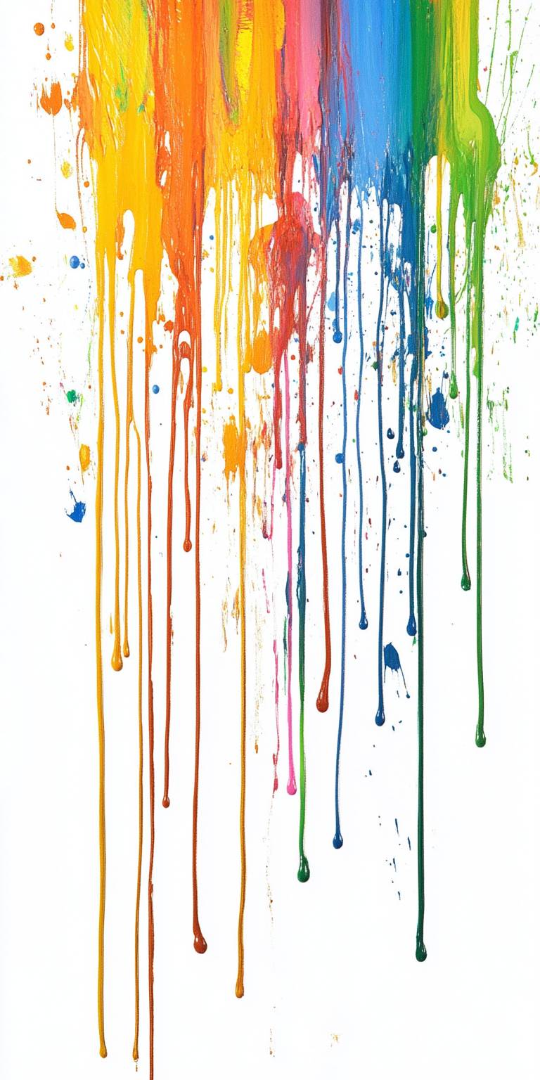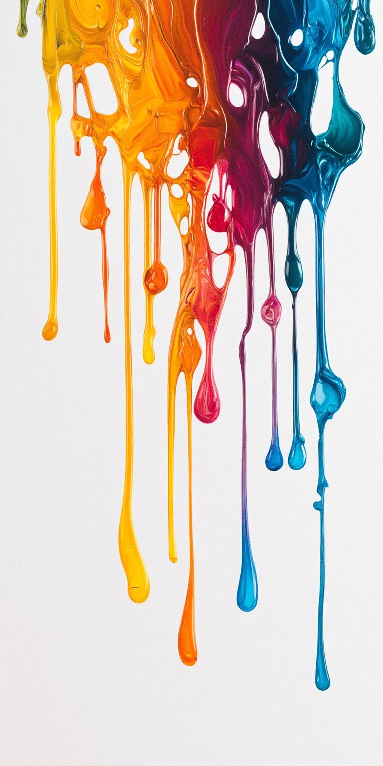 Bunte Farbe tropft von oben nach unten auf einem weißen Hintergrund.