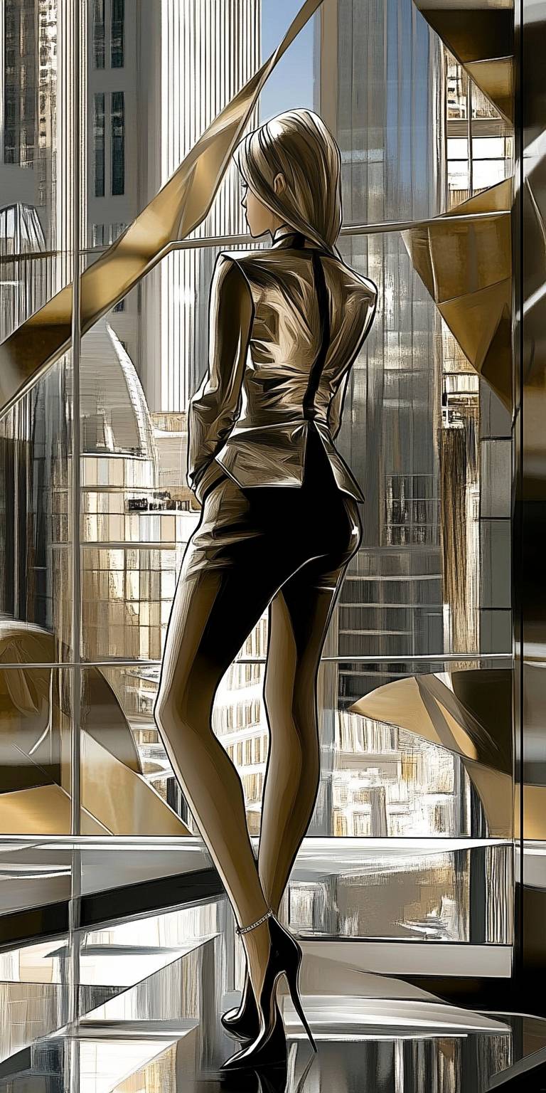 Anime-Weiblich Charakter, schickes Business, Bleistiftrock, Bluse, Blazer, hohe Schuhe, modernes Büro.