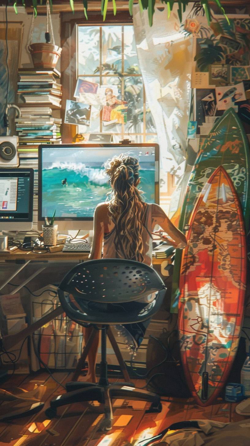 In einem Zimmer einer Surferin sitzt das Mädchen mit dem Rücken zur Kamera und nimmt ein Drittel der linken Bildschirmseite ein, während sie an einem Computer arbeitet, und rechts neben ihr steht ein Surfbrett.