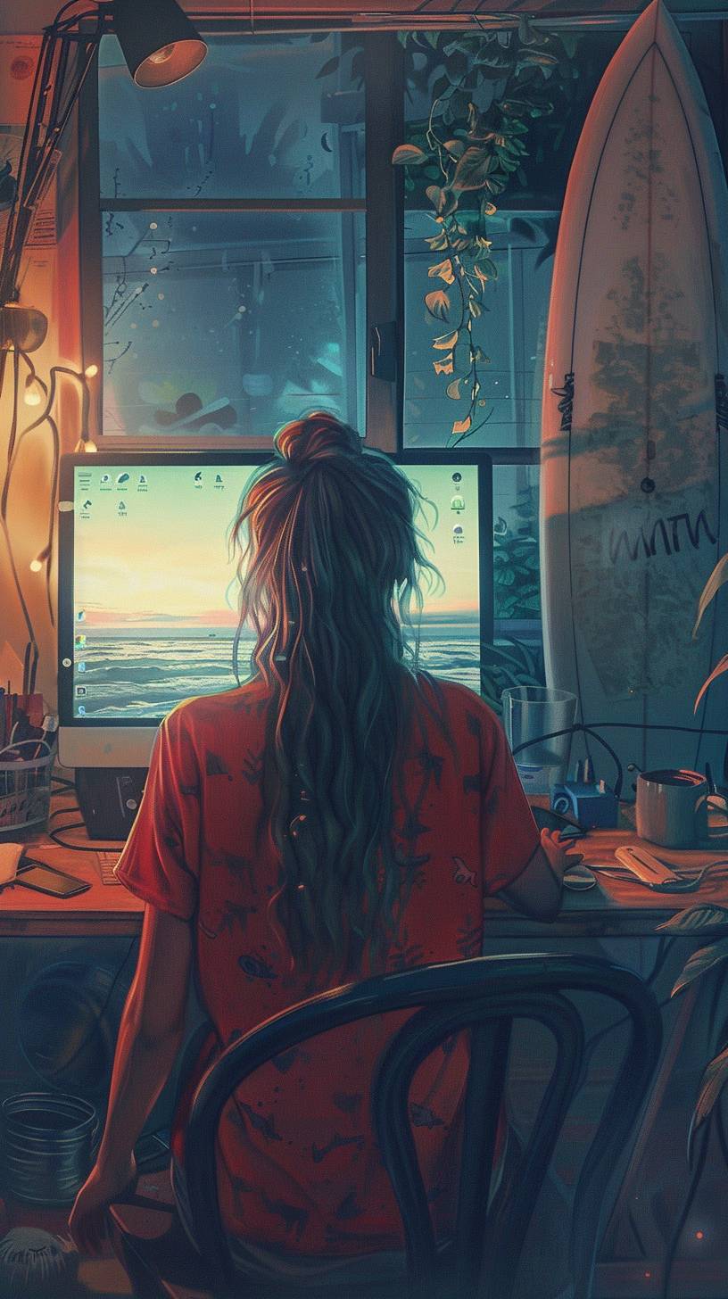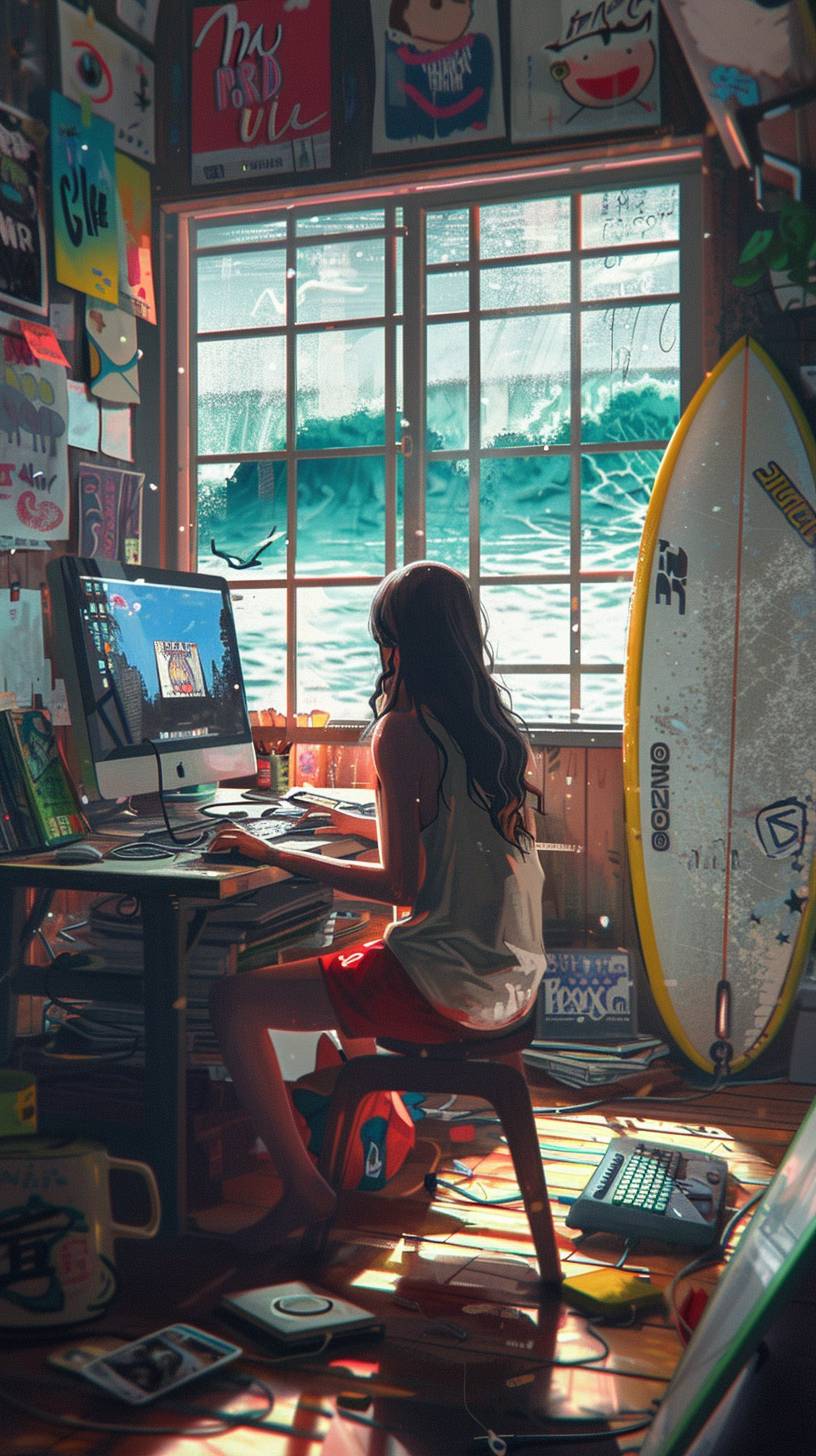 A surfer women room , the girl sits with her back to the frame and occupies one-third of the left side of the screen, working on a computer, in the other two thirds there is a surfboard next to her on the right side, --ar 9:16 --v 6.0