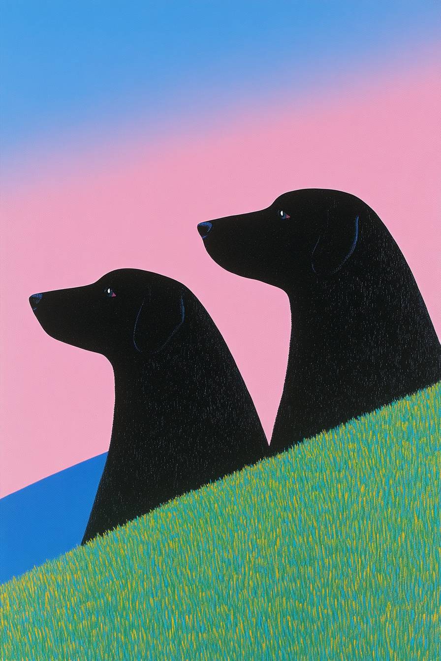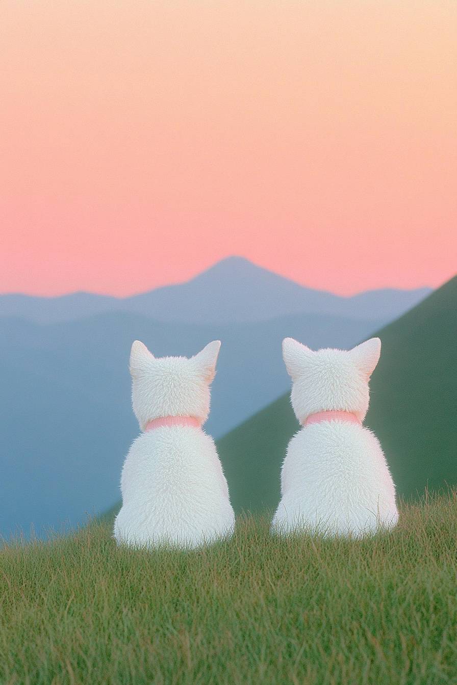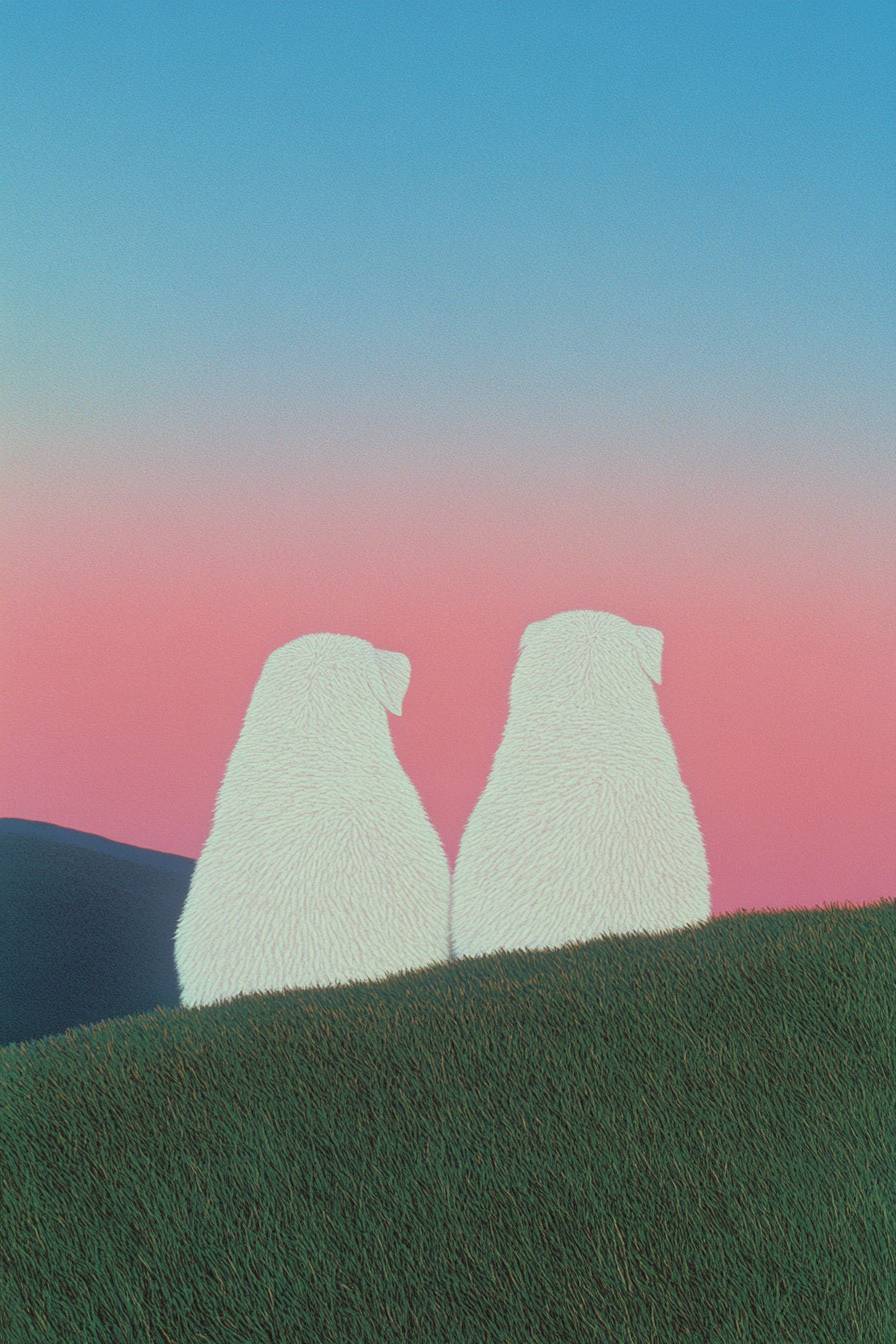 Zwei kleine Hunde sitzen auf der Anhöhe und beobachten den Sonnenuntergang, eine große Szene.