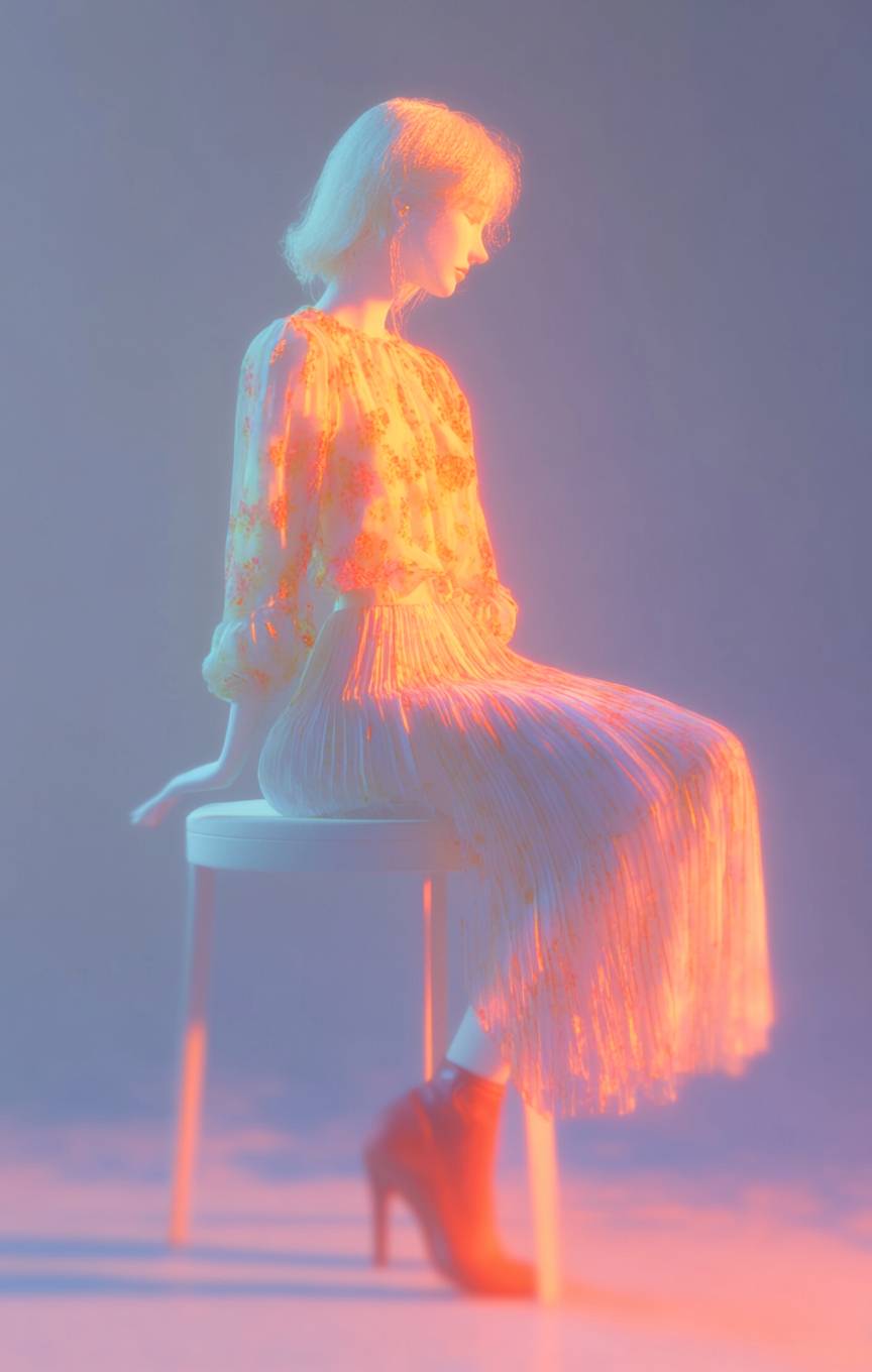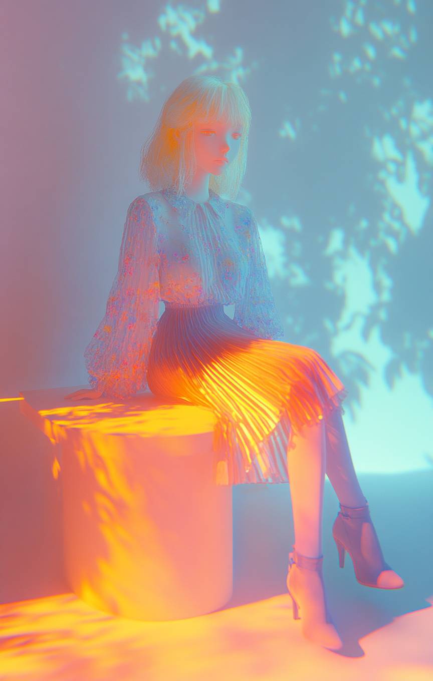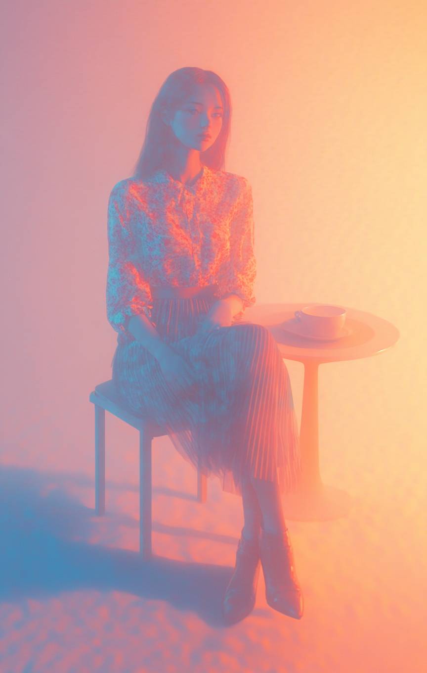Ein Anime-Mädchen, das ein lässig-schickes Blumenoberteil und einen Faltenrock mit Ankle-Boots in einem Café bei sanftem Sonnenlicht trägt.