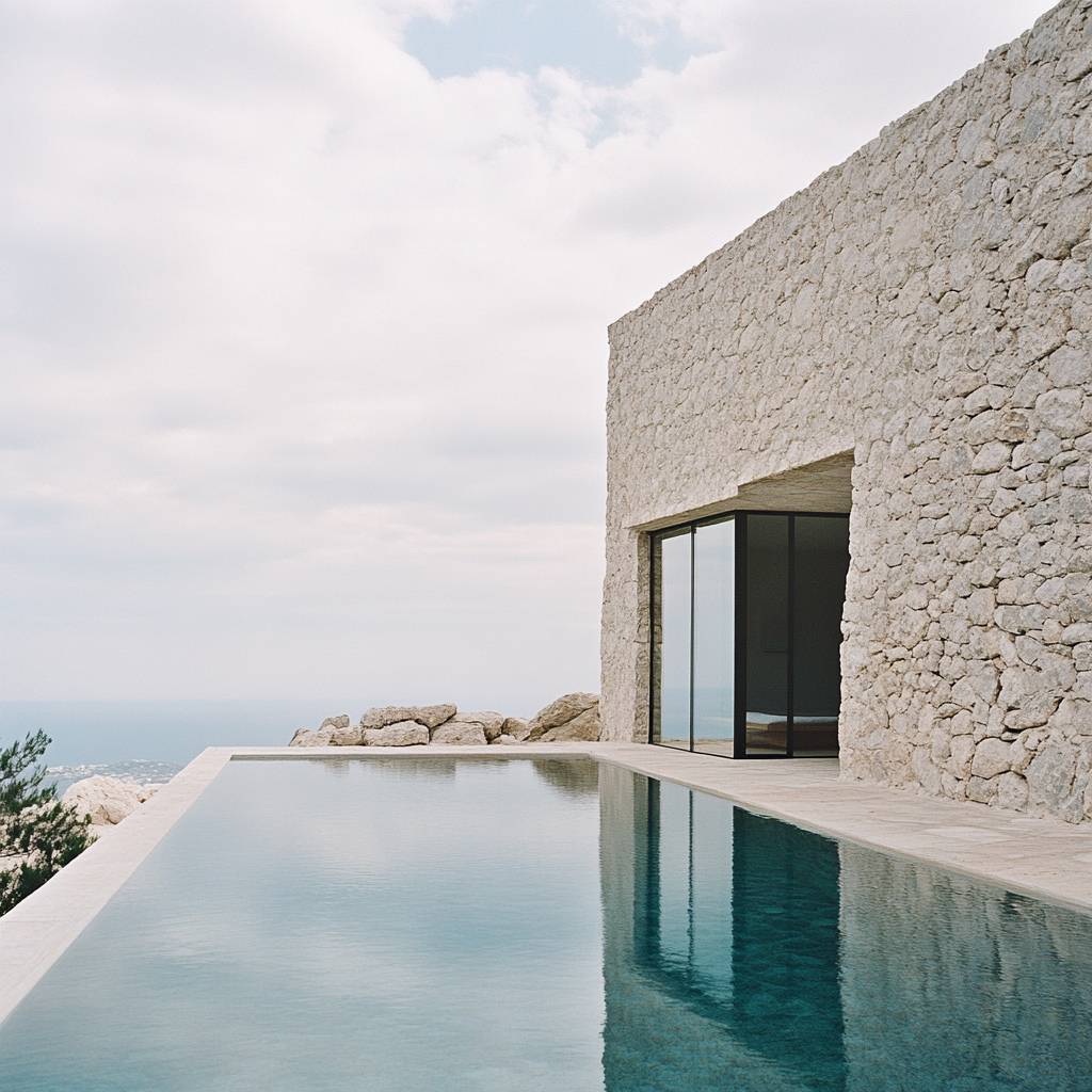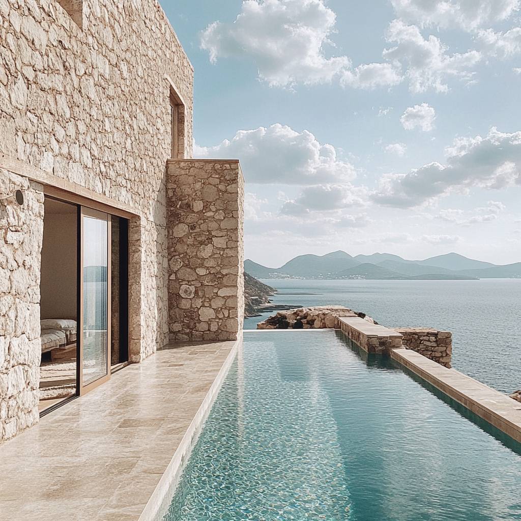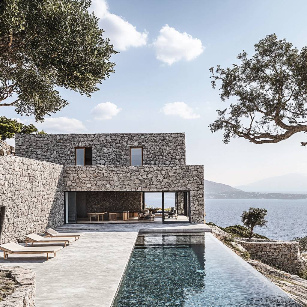 Eine minimalistische Steinvilla auf der griechischen Insel Kythos mit einem Infinity-Pool mit Blick auf die Ägäis.