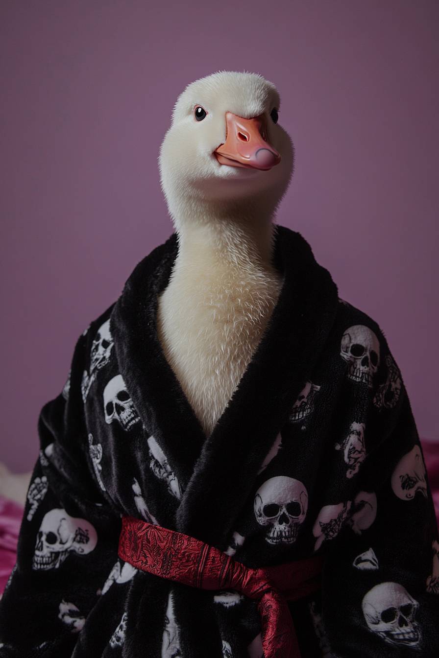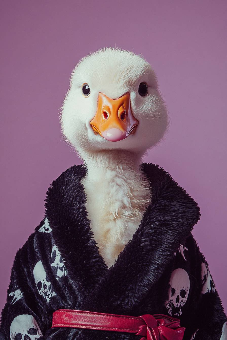 frontal upper body editorial fashion studio portrait of an anthropomorphic cute goose wearing minimal styled black plush bathrobe Versace like with cute white pirate skull pattern and a red bathrobe belt, pastel purple background, cinematography and photoshot by Wes Anderson and David LaChapelle --ar 2:3 --stylize 250 --v 6.1