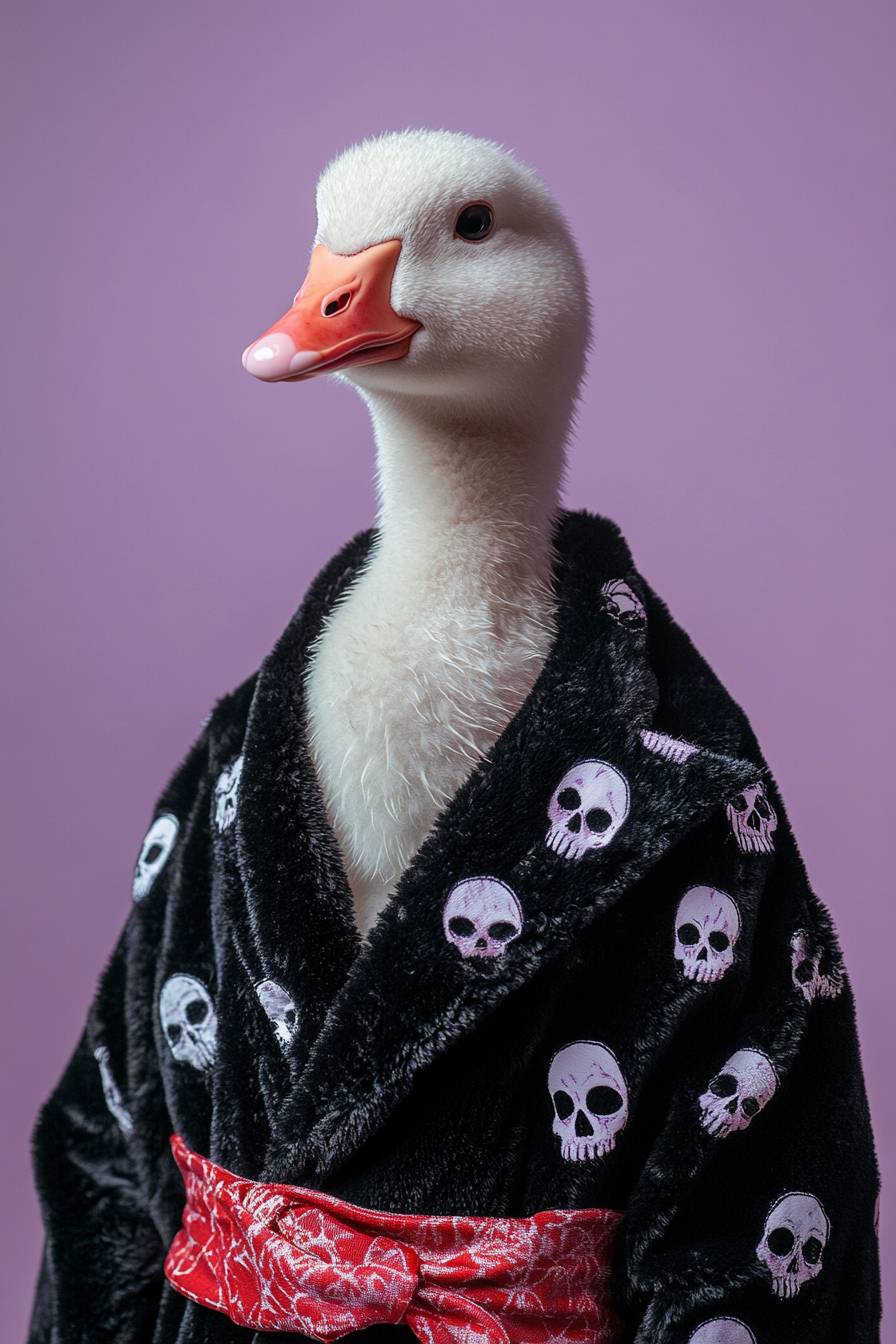 Frontale Oberkörper-Editorial-Fashion-Studio-Porträt eines anthropomorphen süßen Gans, die einen minimalistisch gestalteten schwarzen Plüschbademantel trägt, der an Versace erinnert, mit einem süßen weißen Piratenschädelmuster und einem roten Bademantelgürtel, auf Pastelllila Hintergrund, Kino und Fotos von Wes Anderson und David LaChapelle.