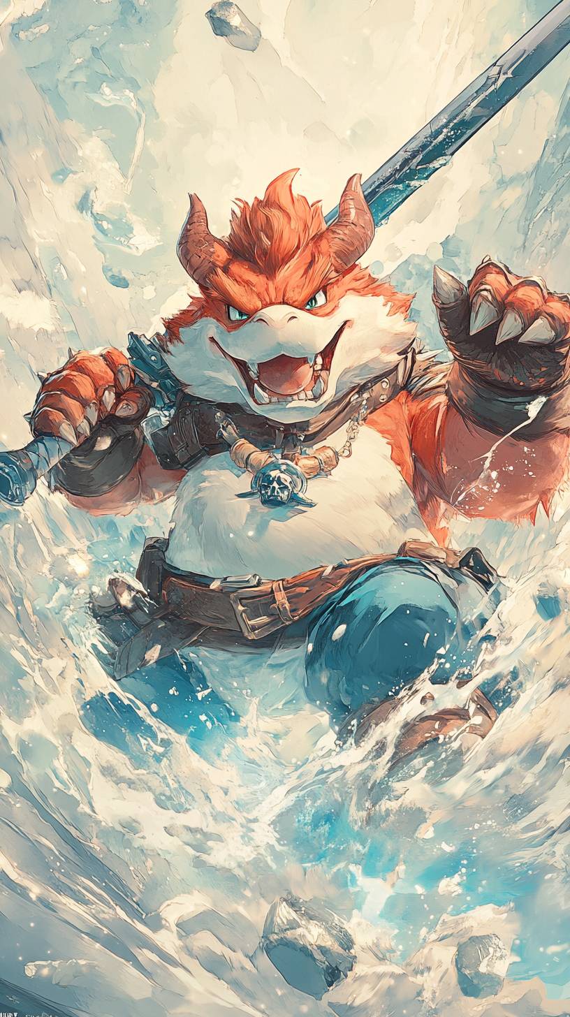 Bowser from nintendo, holding magical sword with 2 hand, portrait superhero dynamic pose, unreal engine inspired by world of warcraft, with white background --chaos 10 --ar 9:16 --personalize pi7vv23 --stylize 900 --v 6.1
