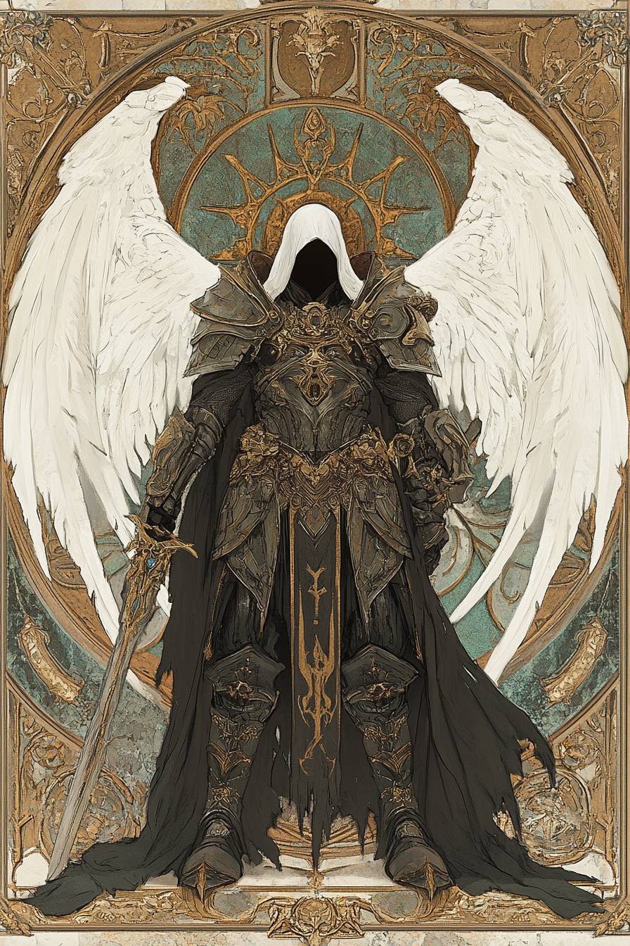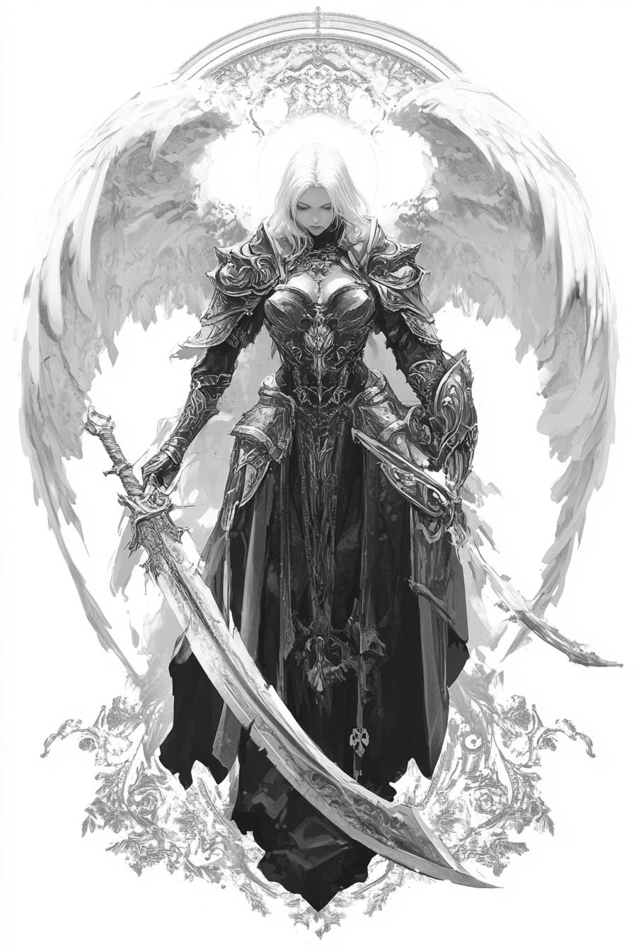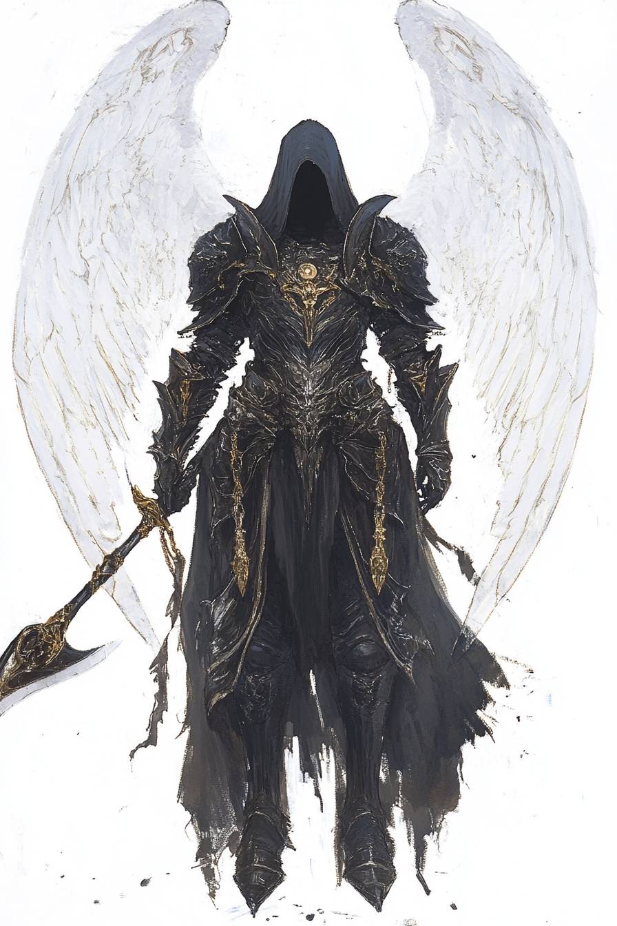 Trending auf ArtStation, kombinierend die Stile von MTG und Jim Fitzpatrick, mit einem Engel des Todes in atemberaubender Eleganz, der eine tief ausgeschnittene Maxikleid-Rüstung trägt und eine Sense mit weißen Flügeln schwingt.