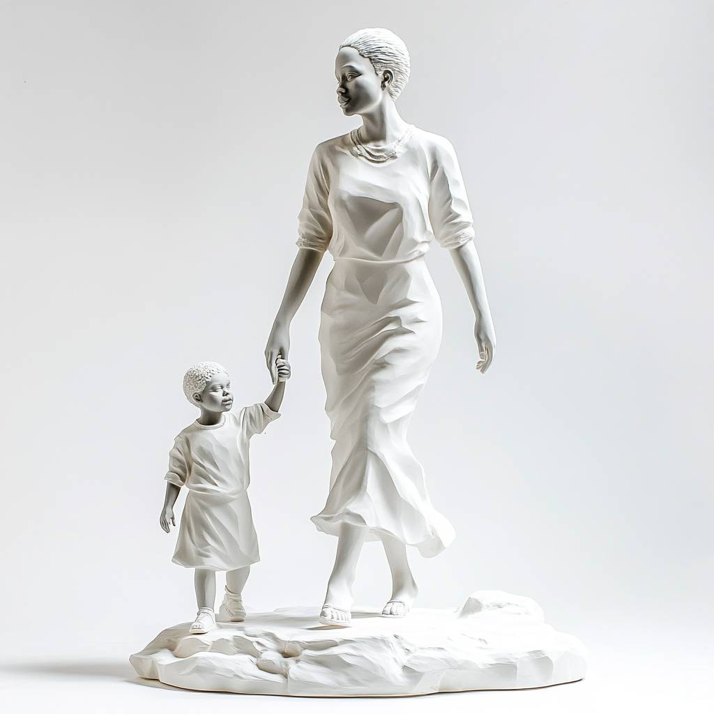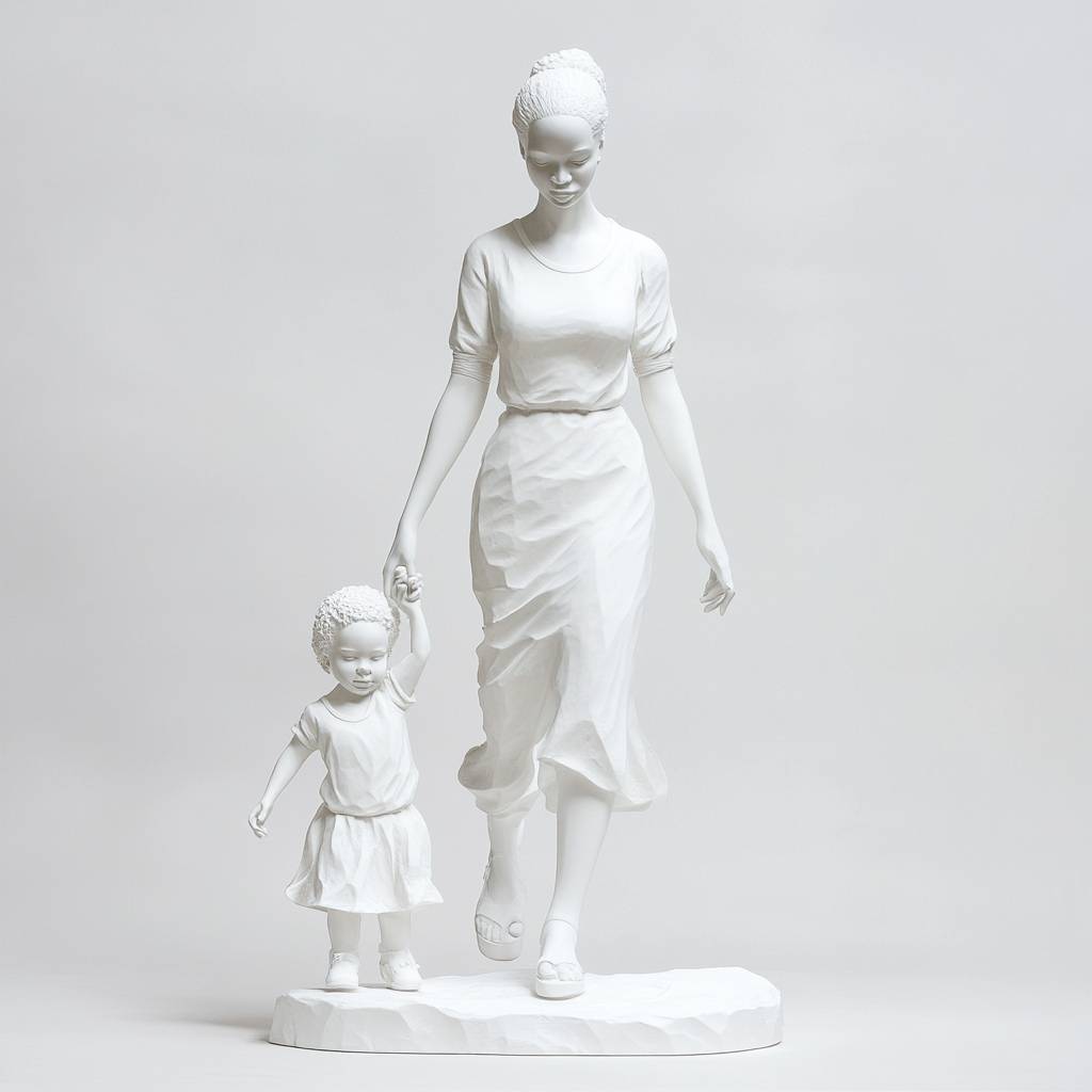 Eine vollständig weiße Statue einer afroamerikanischen Frau, die die Hand ihres Kindes hält und in einem vollständig weißen Park geht, mit einem vollständig weißen Hintergrund.