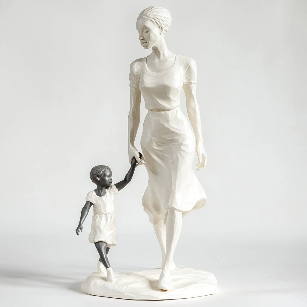 Eine weiße Ganzkörperstatue einer afroamerikanischen Frau, die die Hand ihres Kindes hält und in einem völlig weißen Park mit weißem Hintergrund spaziert.