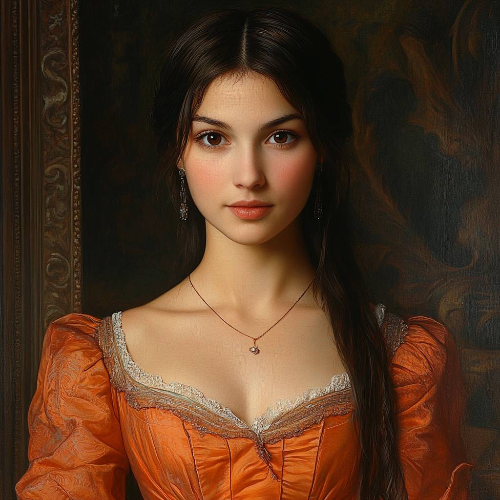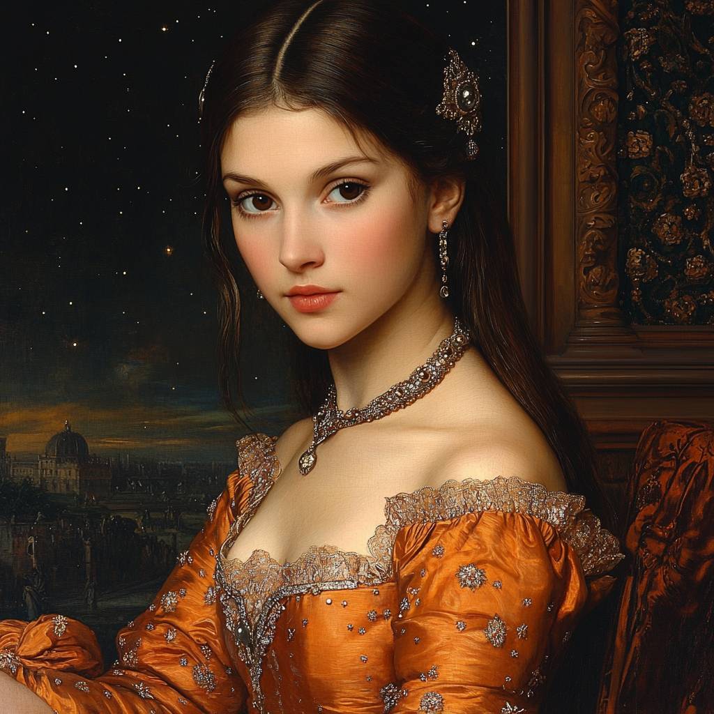 A masterpiece by Titian, a princess in an orange dress. beautiful woman with long dark brown hair, with brown eyes, dark patterned background, mesmerizing, composition, interesting background, striking, stars, natural skin tone, accurate --style raw --stylize 500 --v 6.1