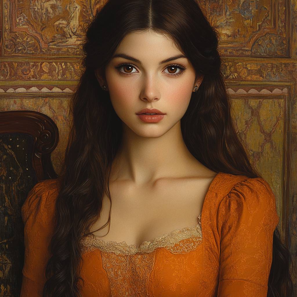 Ein Meisterwerk von Tizian, das eine Prinzessin in einem orangefarbenen Kleid darstellt, mit langen dunkelbraunen Haaren und braunen Augen, vor einem faszinierenden Hintergrund.