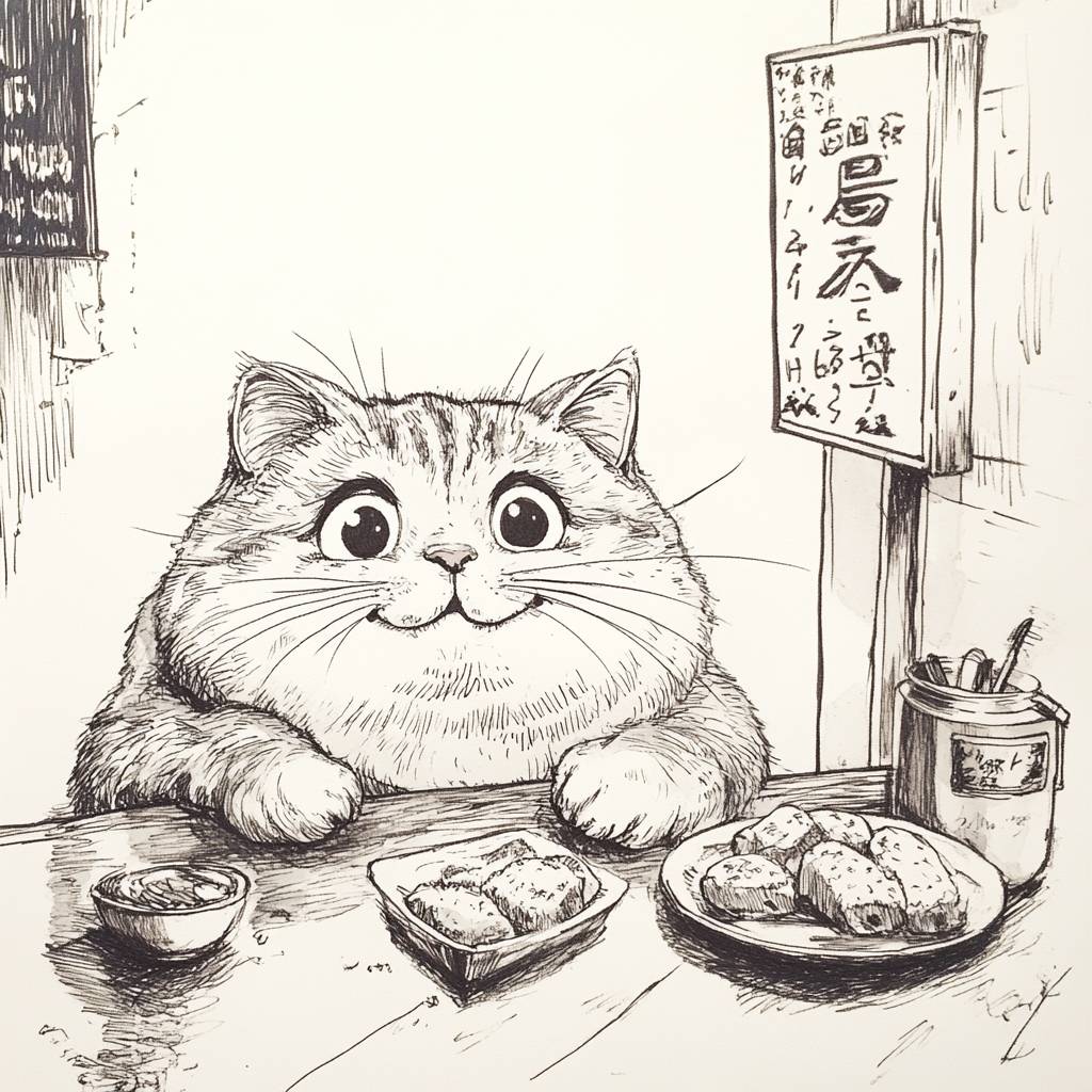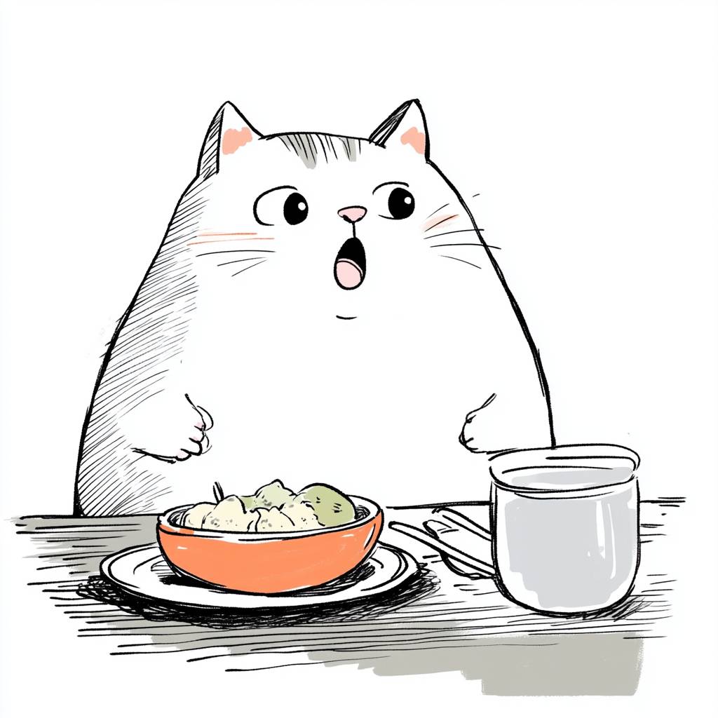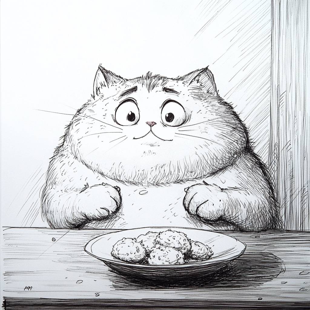Eine Cartoonzeichnung einer glücklichen dicken Katze, die auf Essen starrt.