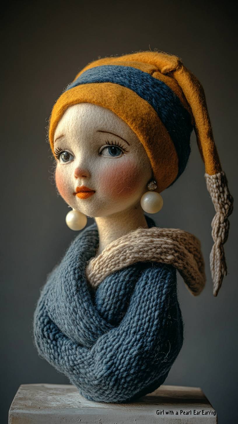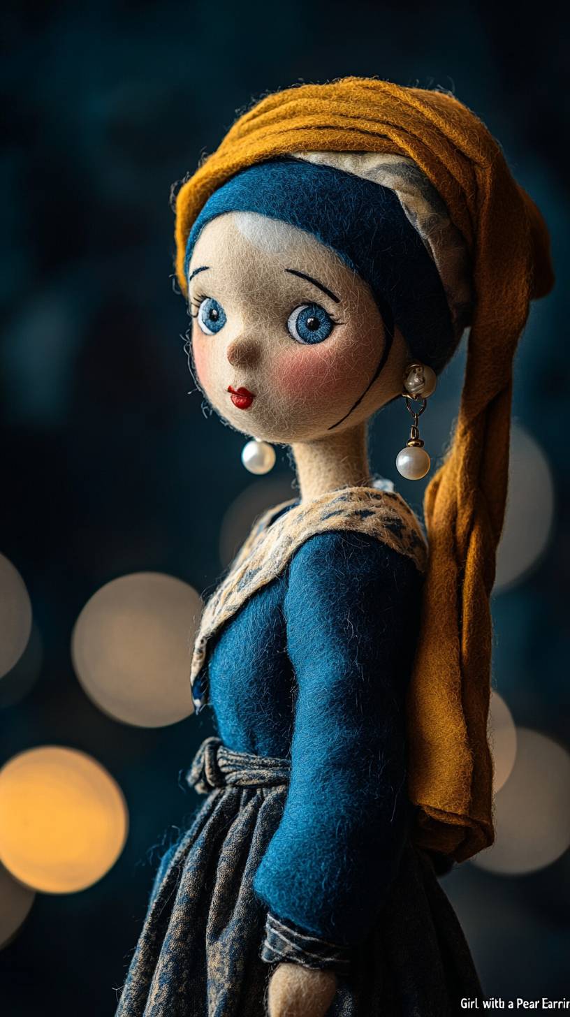 Famous painting "Girl with a Pearl Earring" felt art, ultra-high definition 32K, felt material, advanced filters, cute, cartoon wool felt doll, Morandi advanced gray color matching, surrealism, low-angle shooting, light and shadow art, monochrome background ,beautiful,close --ar 9:16 --stylize 250 --v 6.1