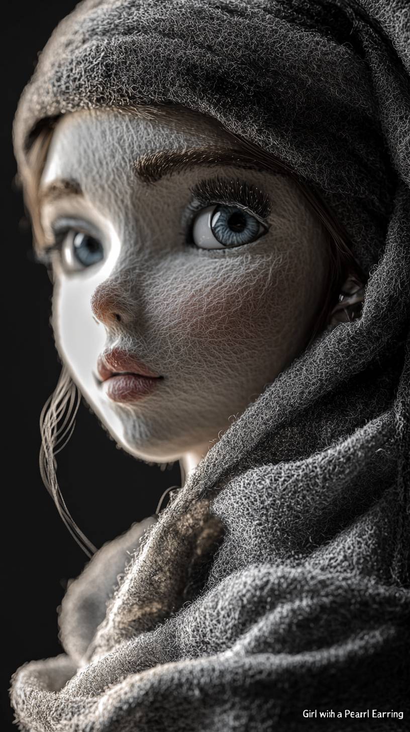 Berühmtes Gemälde 'Mädchen mit dem Perlenohrring', Filzkunst, Ultra-HD 32K, Filzmaterial, fortgeschrittene Filter, süß, Cartoon-Wollfilzpuppen, Morandi-advanced Graufarbenkombination, Surrealismus, Aufnahmen aus niedriger Perspektive, Licht- und Schattenkunst, monochromer Hintergrund, schön, Nahaufnahme