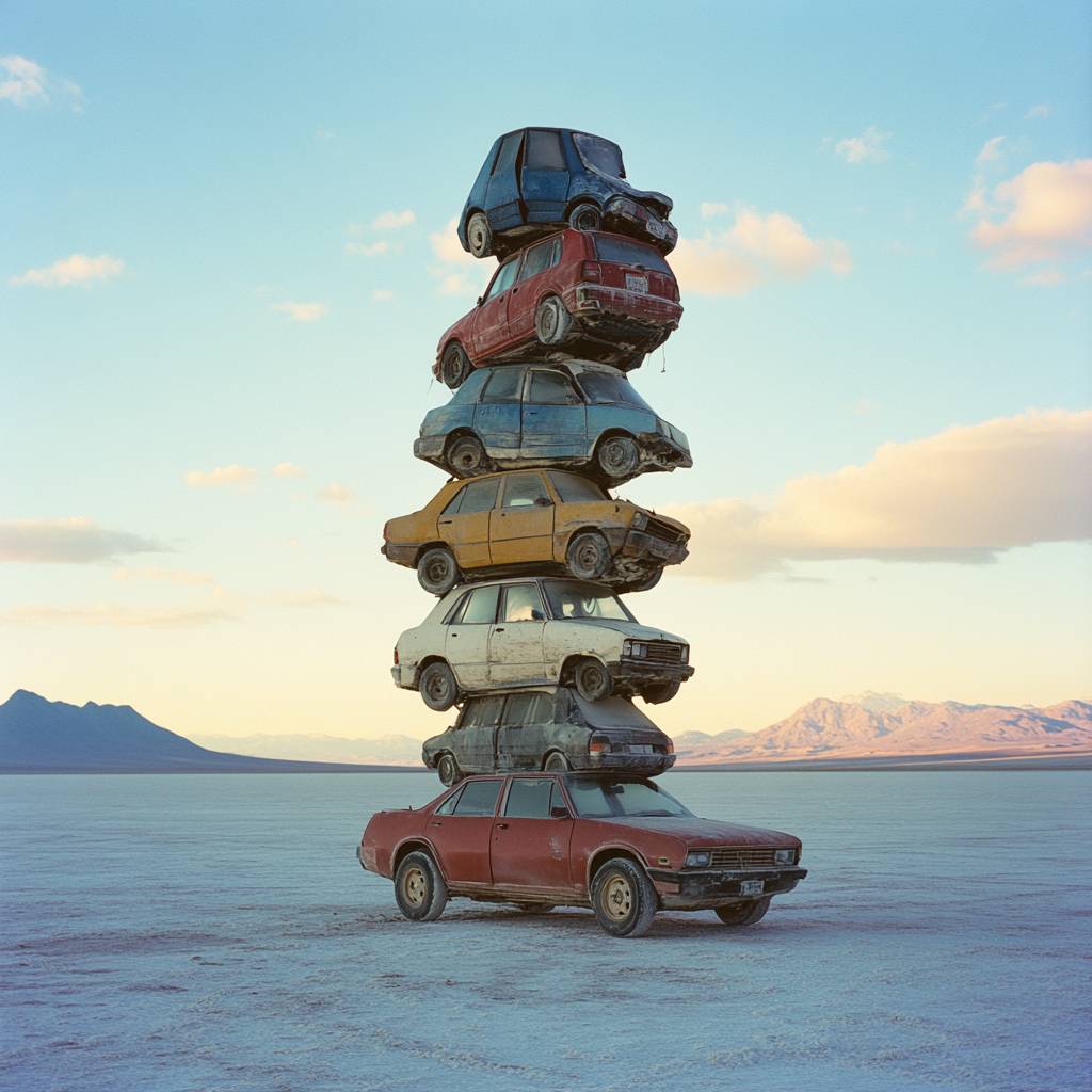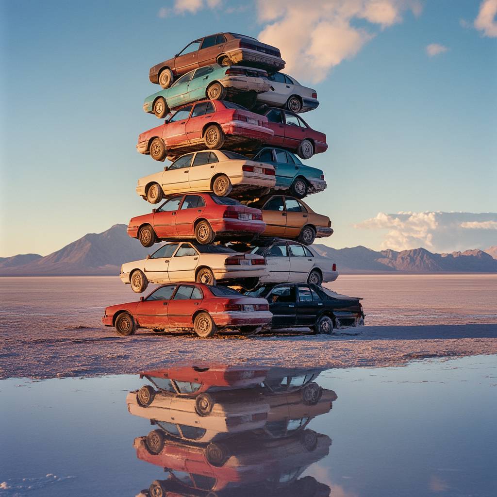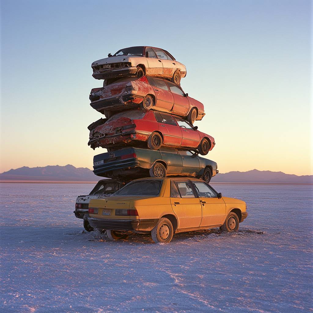 Ein Stapel gebrauchter Elektroautos im Salar de Uyuni bei Morgenlicht, fotografiert mit einer Hasselblad 503CWD und einem Carl Zeiss Planar f/2.8 80mm Objektiv.
