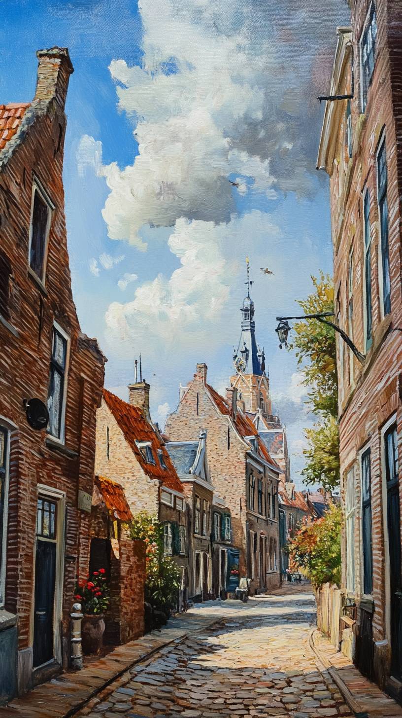 an oil on canvas painting showing a view of the Delft cobblestone street in 17 century, rich and immersive, exuberant, in the style of dutch golden age, romanticized views, with photorealistic attention to detail, in correct perspective with strong verticals, in the style of Pieter Brueghel the Younger, in the exquisite color shades of dutch golden age --ar 9:16 --v 6.1