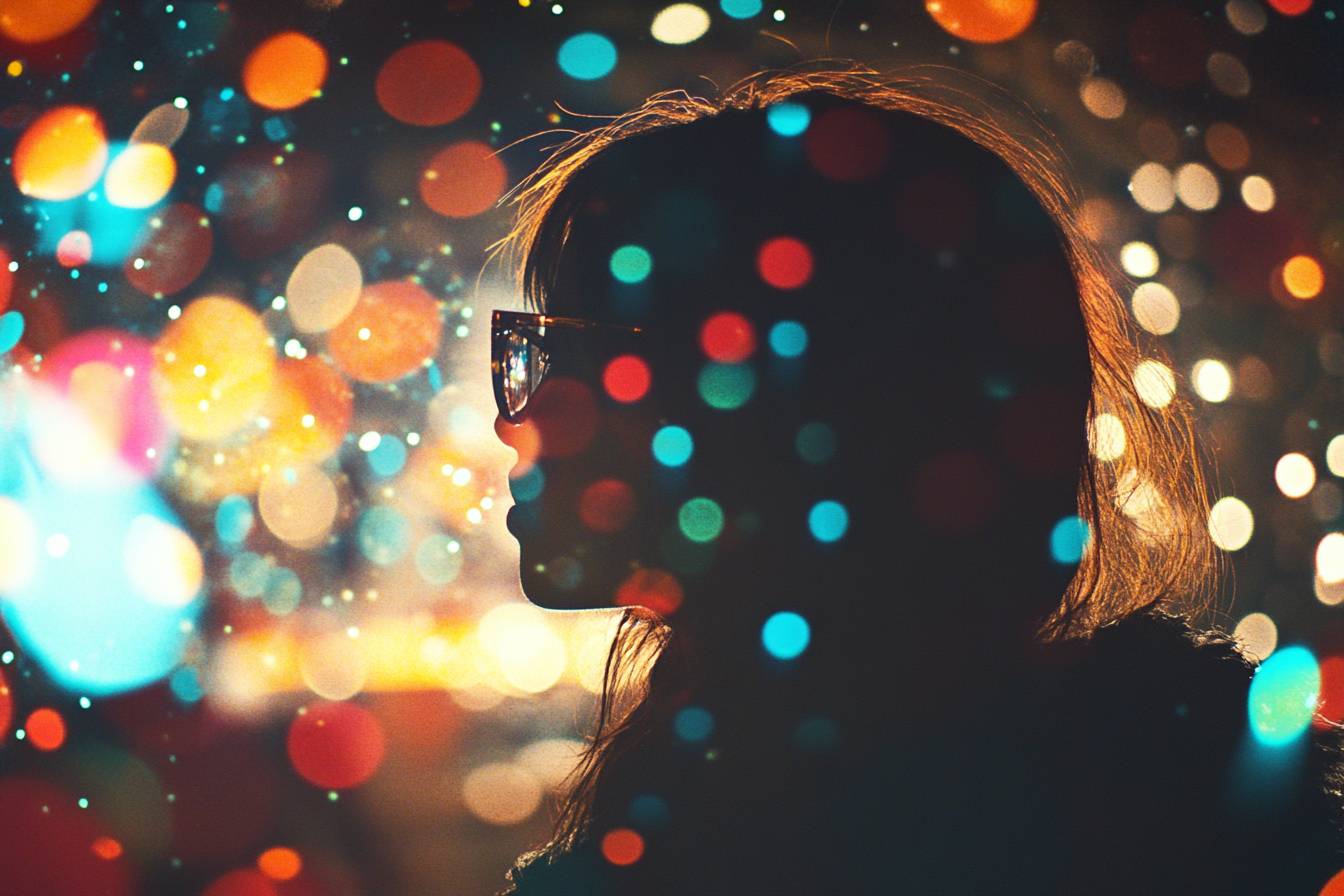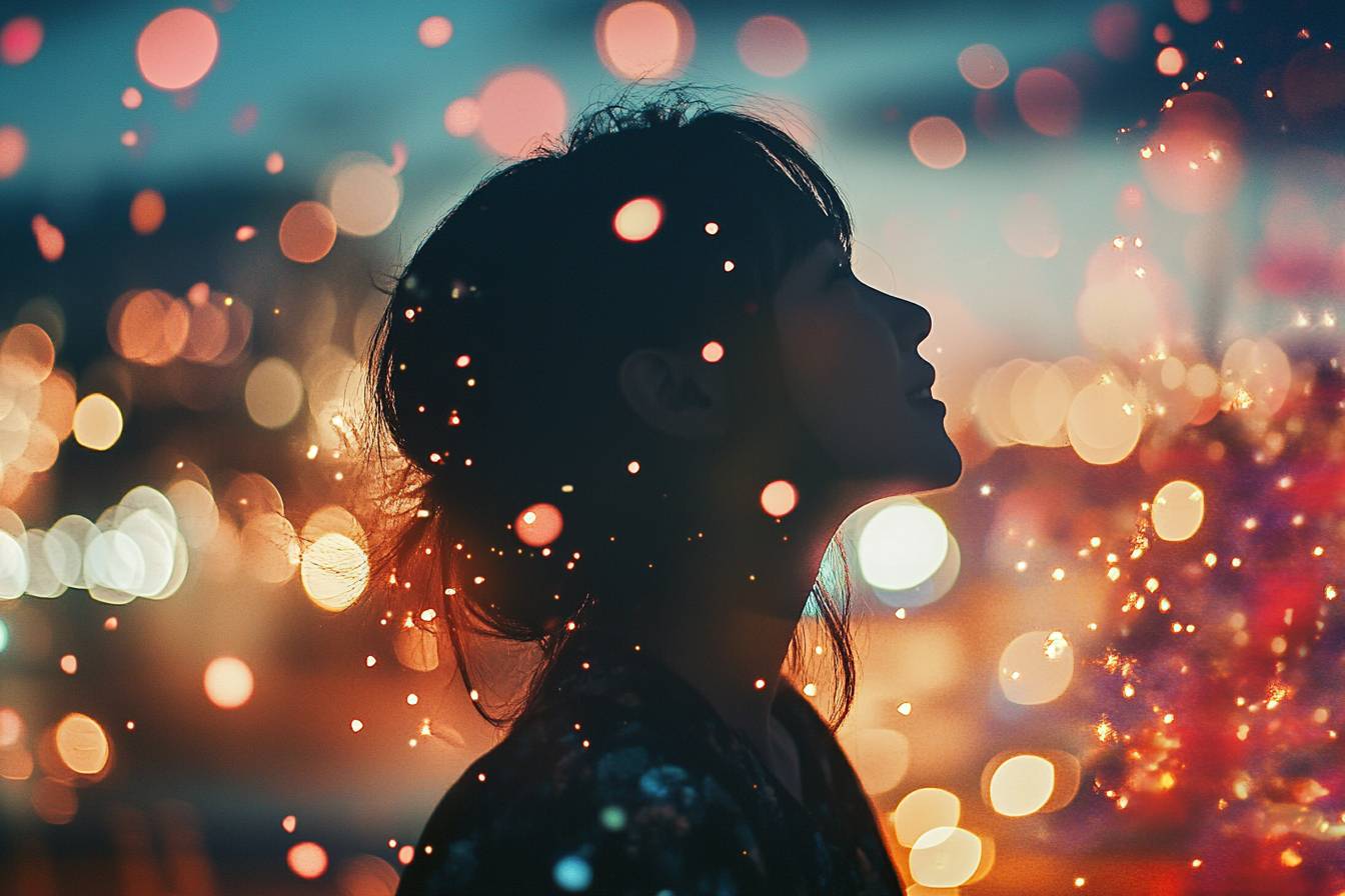 [SUBJECT] enjoying a Festival Firework Spectacle, with exploding colors and lens flares filling the night sky. Utilize vibrant [COLOR1] and [COLOR2] to capture the celebratory mood --v 6.1 --ar 3:2