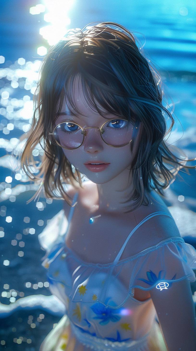 Ein fesselnder 3D-Anime-Render einer modischen Mädchen, das an einem ruhigen Nachtstrand steht. Die sanften Wellen streicheln den Strand und reflektieren den mondbeschienenen Himmel. Sie trägt ein halbtransparentes weißes Sommerkleid, das mit zarten blauen und gelben Blumenmustern verziert ist. Sie trägt eine schmalrahmige Brille, die mode und Technologie vereint, und ihre fesselnden Augen reflektieren das sanfte Licht der Umgebung. Der traumhafte Bokeh-Effekt im Hintergrund erzeugt eine Tiefenunschärfe und verstärkt die atmosphärische Qualität der Szene. Dieses bezaubernde Bild verbindet nahtlos Elemente der Mode, Anime und Porträtfotografie, um ein visuell atemberaubendes und fesselndes Kunstwerk zu schaffen. Das cineastische Gefühl und die lebendigen Farben machen diese Szene wirklich fesselnd.