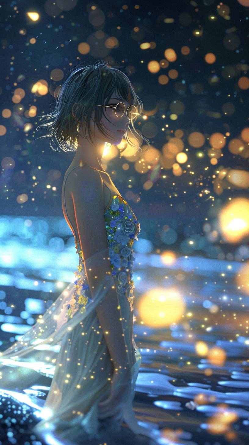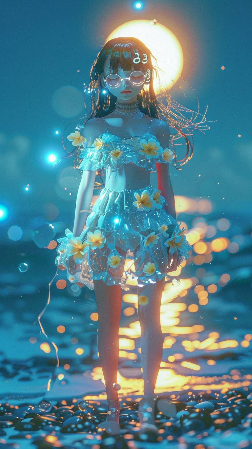 A mesmerizing 3D anime render of a fashionable girl standing on a serene night beach. The gentle waves caress the shoreline as they reflect the moonlit sky. She is dressed in a semi-transparent white sundress, adorned with delicate blue and yellow flower patterns. She wears thin-framed glasses that blend fashion and technology, and her captivating eyes reflect the soft glow of the surrounding environment. The dreamy bokeh effect in the background creates a depth blur, enhancing the atmospheric quality of the scene. This enchanting image seamlessly combines elements of fashion, anime, and portrait photography to create a visually stunning and captivating work of art. The cinematic feel and vibrant colors make this a truly captivating scene., anime, photo, portrait photography, cinematic, fashion, 3d render, vibrant, 3d render, vibrant, cinematic, anime, portrait photography, photo, fashion --ar 9:16 --v 6.0