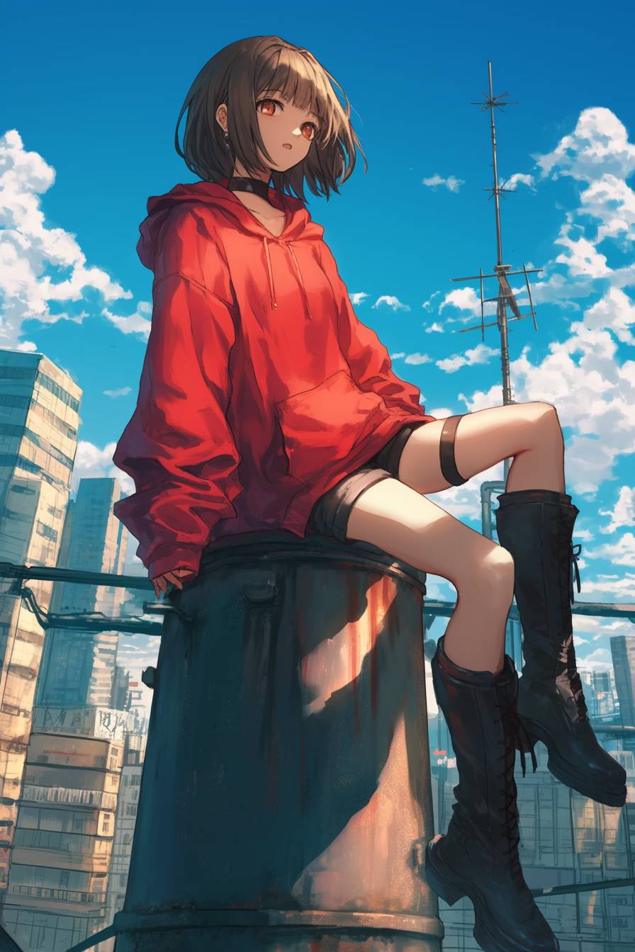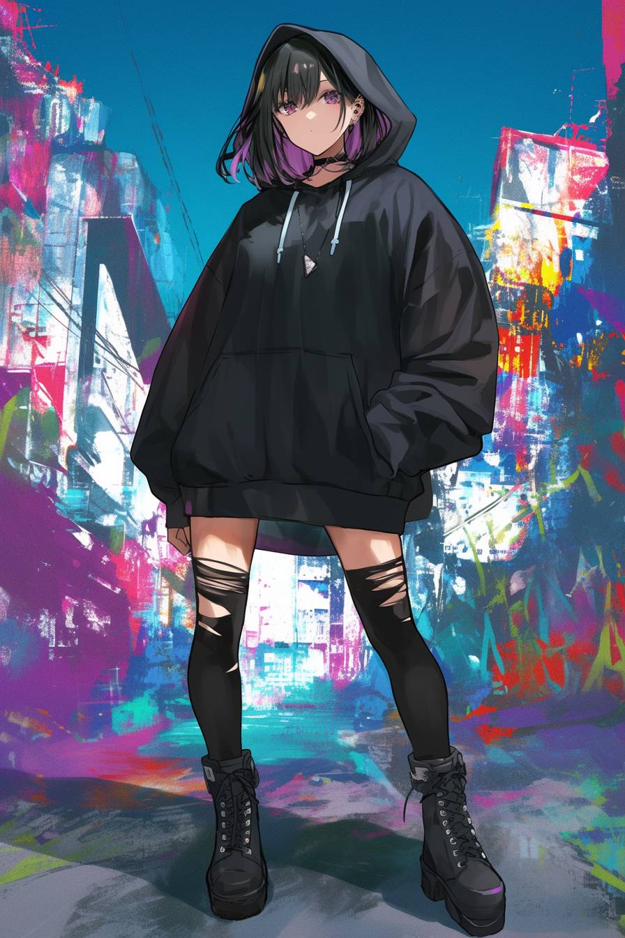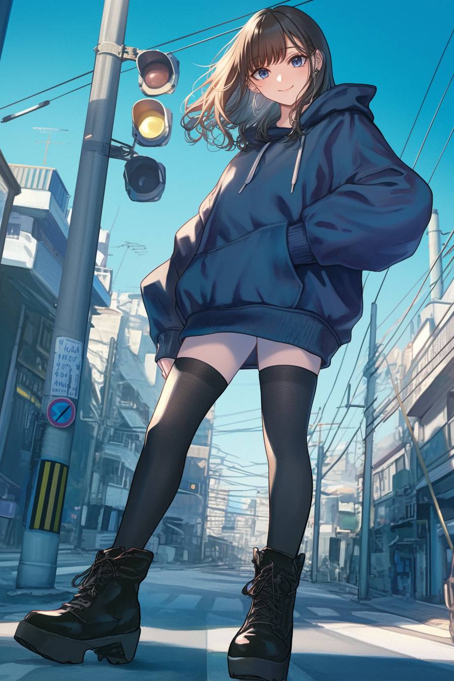 Hina Kinami trägt einen stylischen oversized Hoodie und hohe Stiefel vor einem dynamischen urbanen Hintergrund.
