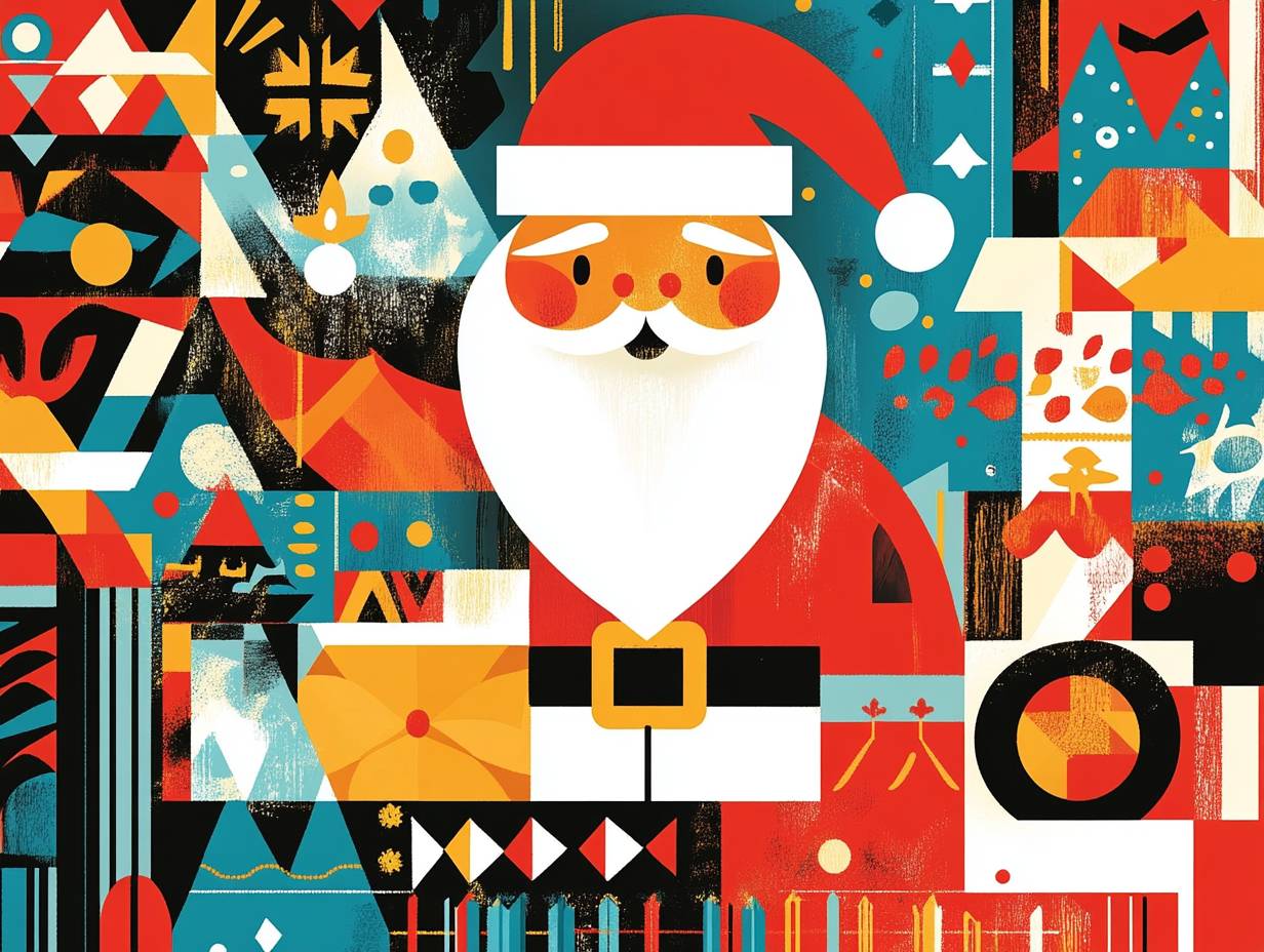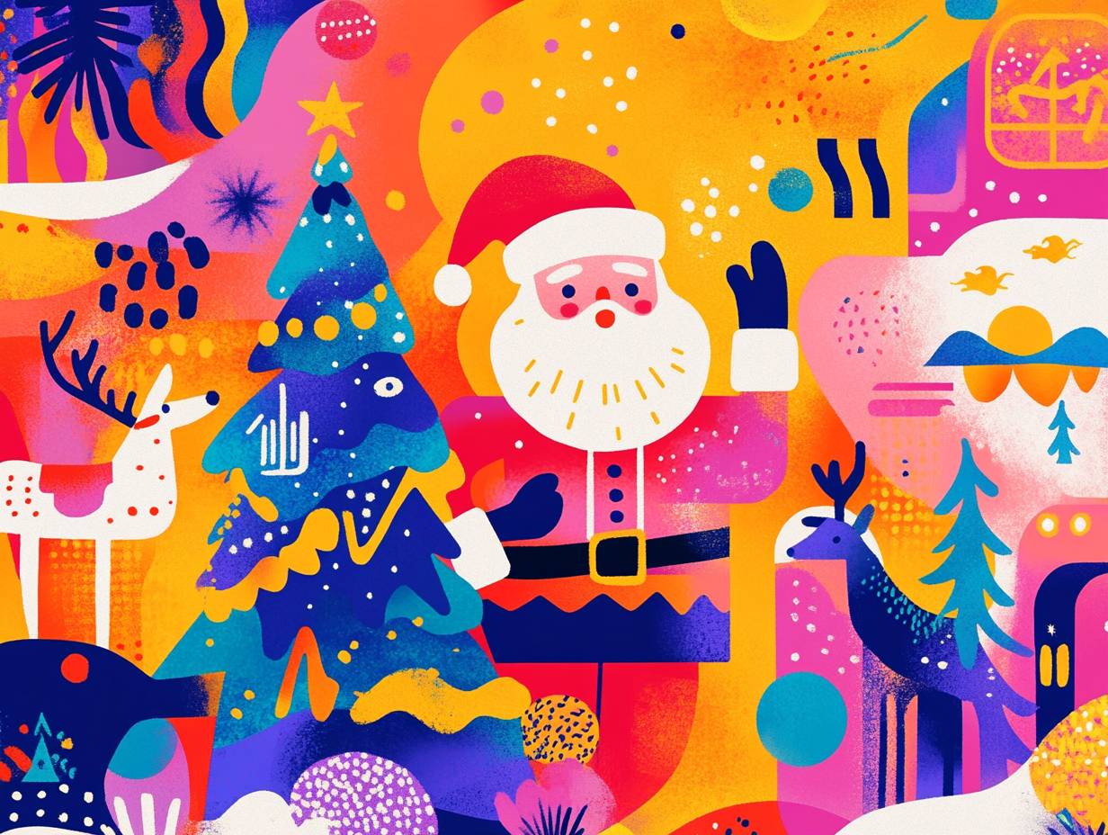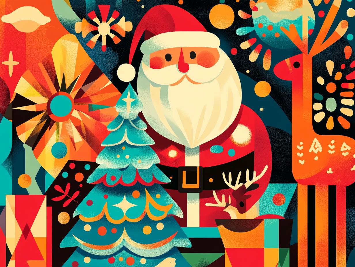 Eine Weihnachtsillustration mit dem Weihnachtsmann, einem Weihnachtsbaum und Rentieren, die helle Farben und kräftige Muster unter Verwendung der Formensprachetechnik kombiniert.