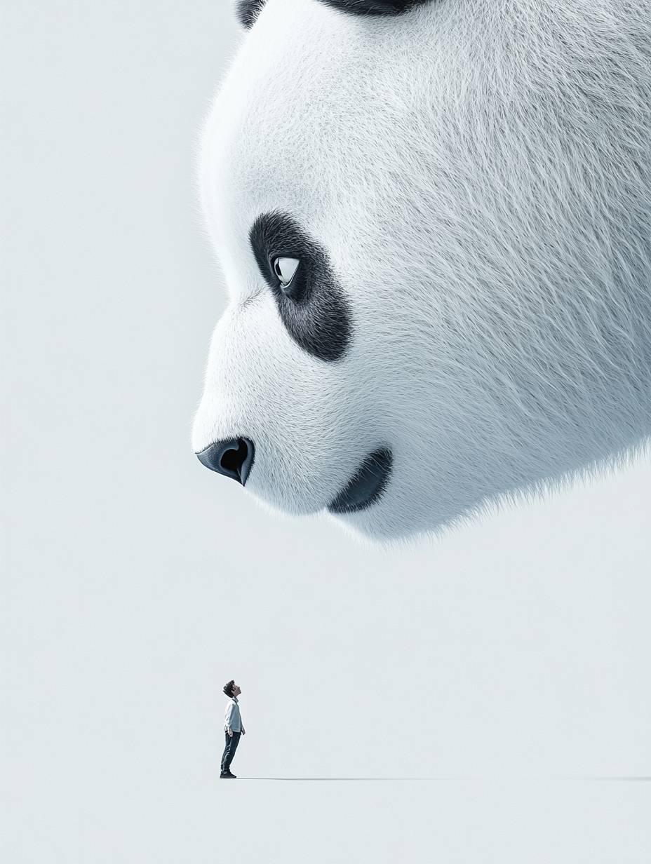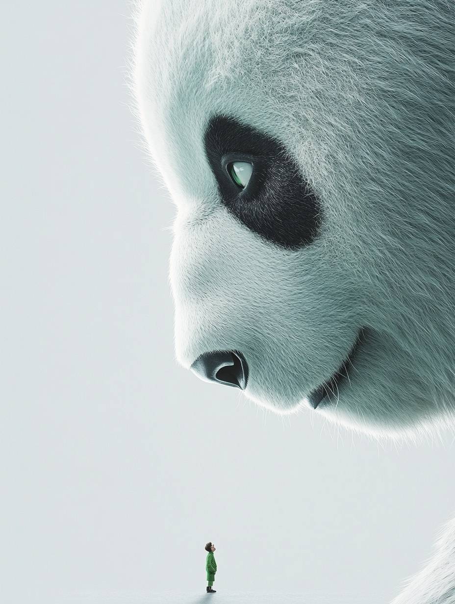 In the movie poster, a cute white giant panda looks down at the little man on the ground. The little man and the panda look at each other, giving people a warm feeling. The background of the picture is pure gray, with a minimalist style. --ar 3:4 --personalize rhld7jg --v 6.1