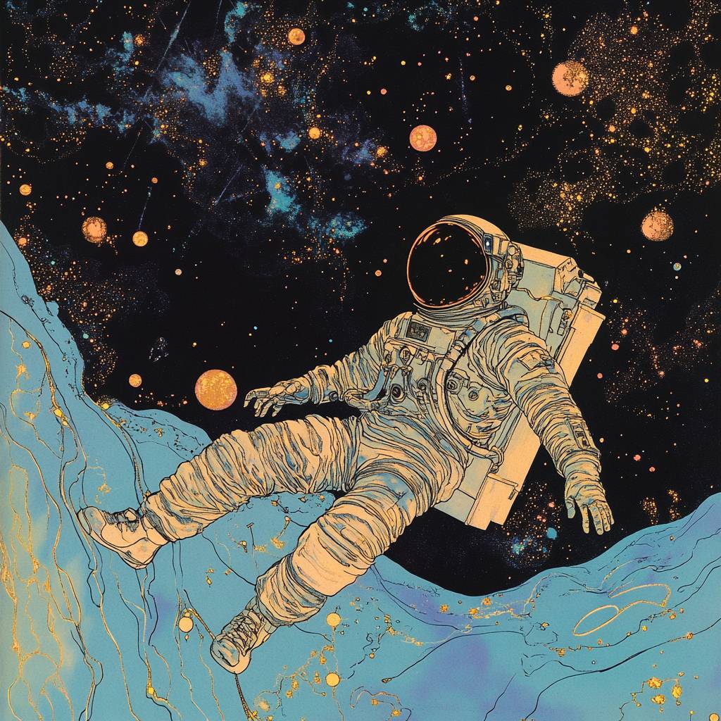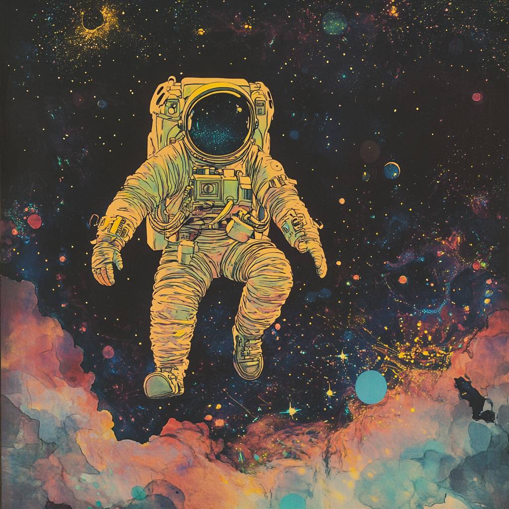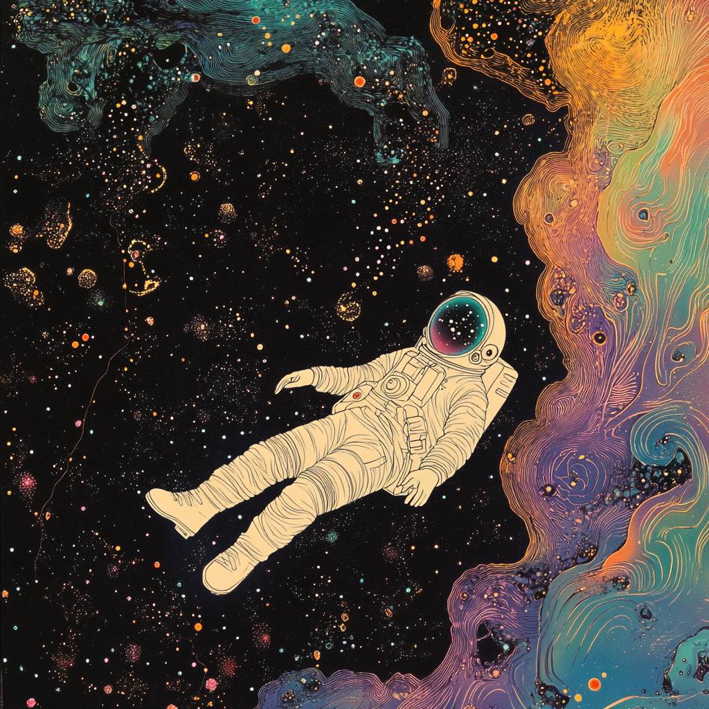 Risograph illustration by Marjorie Miller by William Heath Robinson by Leonora Carrington by Chris Ofili. an astronaut floats in the cosmos. UV colors details.. dark atmosphere. Psychedelic --v 6.1
