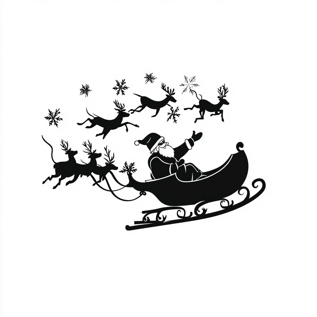 Silhouette of Santa Claus in a sleigh pulled by reindeer flying across the sky, minimalist black vector illustration, clean and simple design, isolated on a white background, ideal for SVG conversion --v 6.1