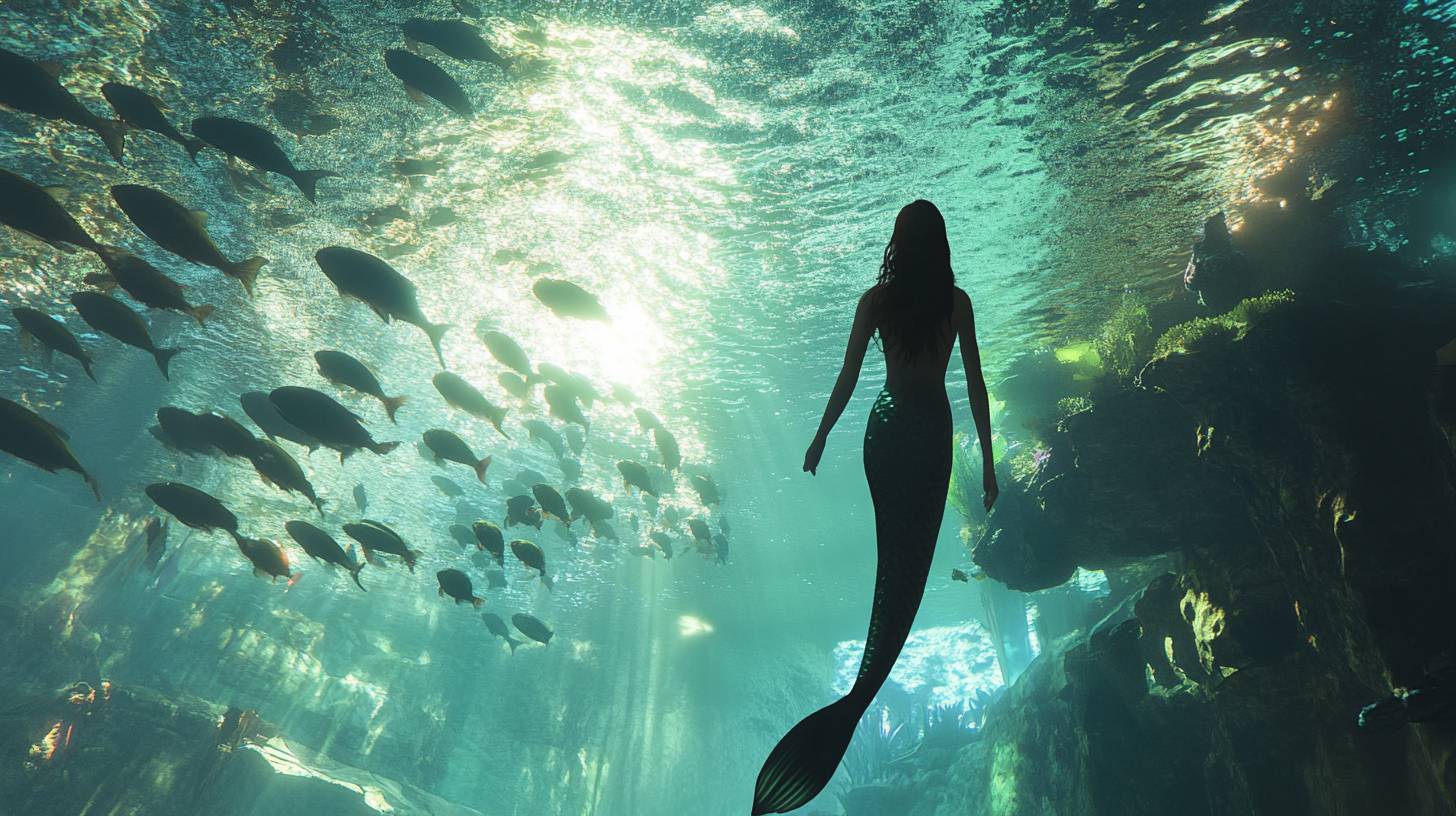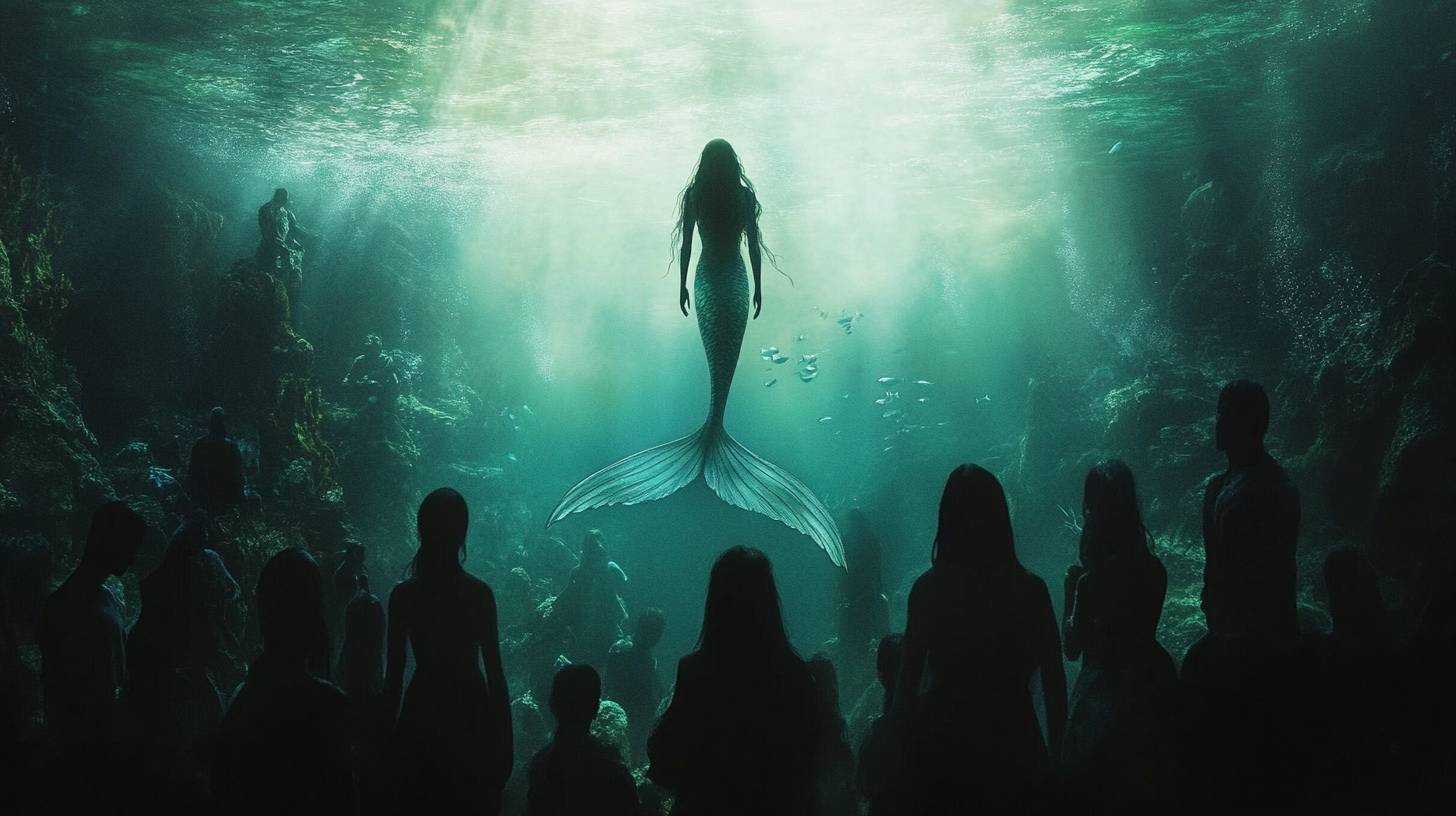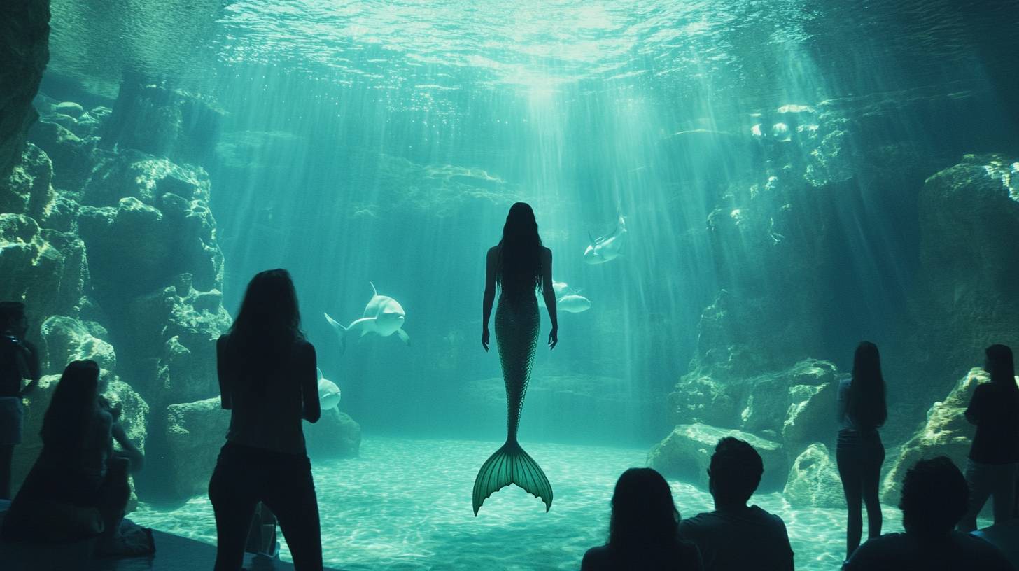 Ein riesiges Aquarium mit einer Meerjungfrau, in das die Leute schauen.