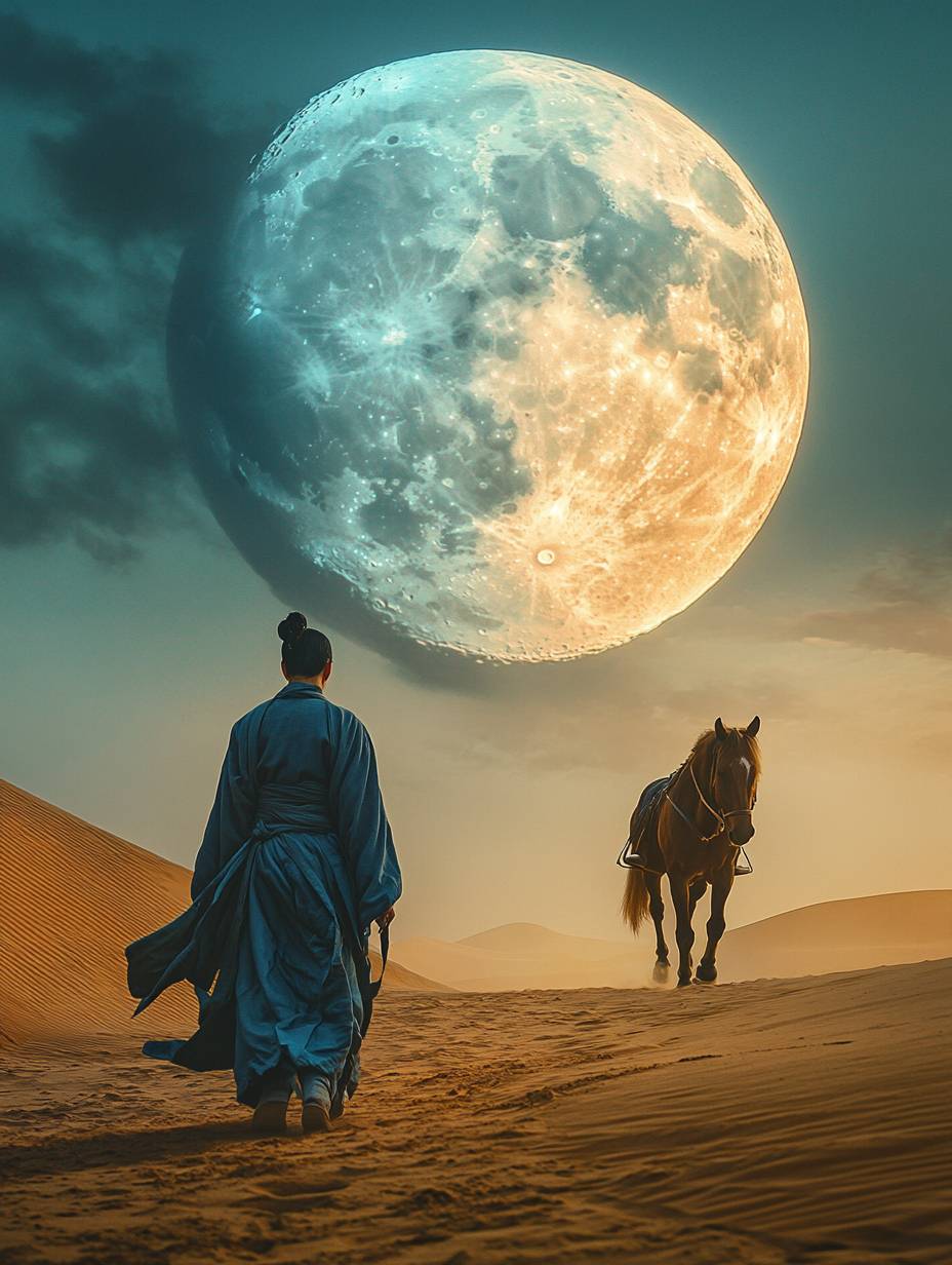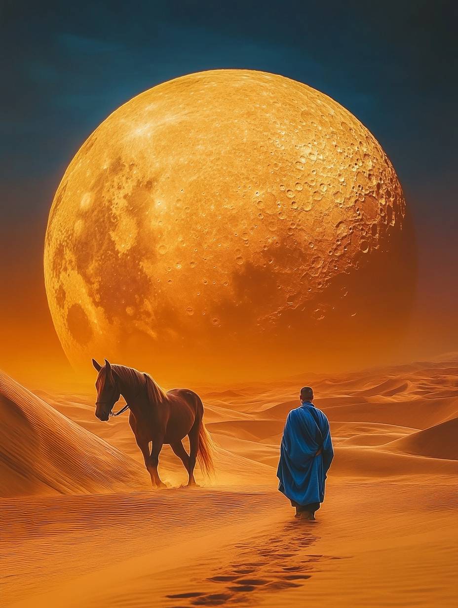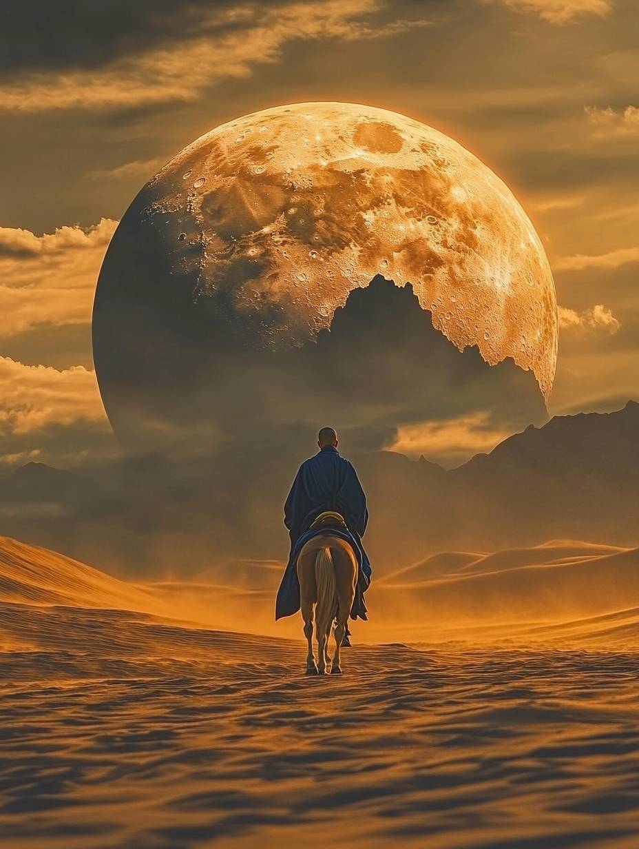 Ein großer runder Mond, Sonnenschein, Sonnenaufgang, gelber Sand. Ein Mönch, Meister Xuanzang, mit gebundenem Haar, in einem blauen und grauen Mönchsgewand, führt ein Pferd durch die weite Wüste, im Stil des Films Dune, Weitwinkelaufnahme, breiter Blick, eine kraftvolle Filmszene, 8k, 16k.