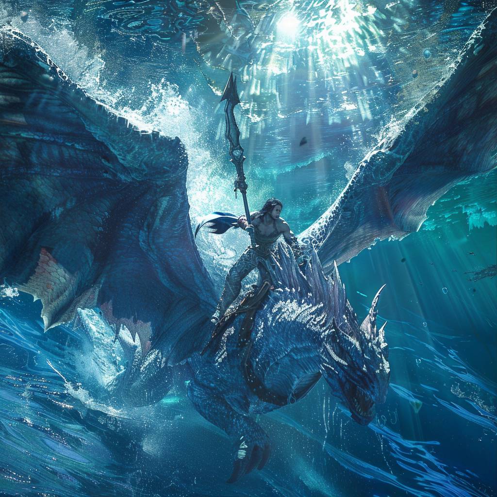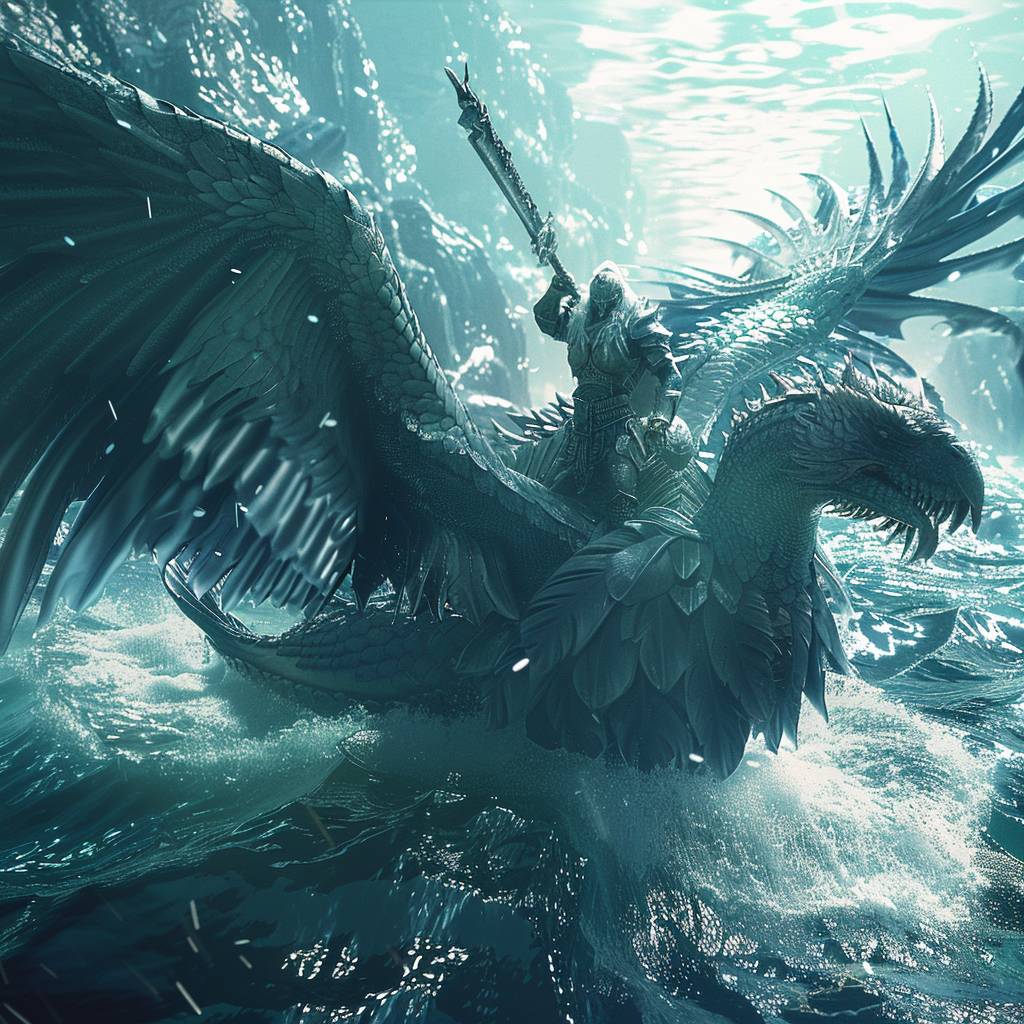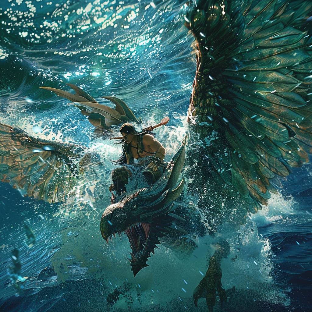 Ein Held, der auf einem riesigen Wesen im Wasser reitet, mit weit ausgebreiteten Flügeln, und eine lebhafte, detaillierte Szene einfängt.