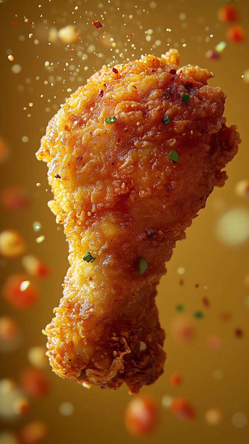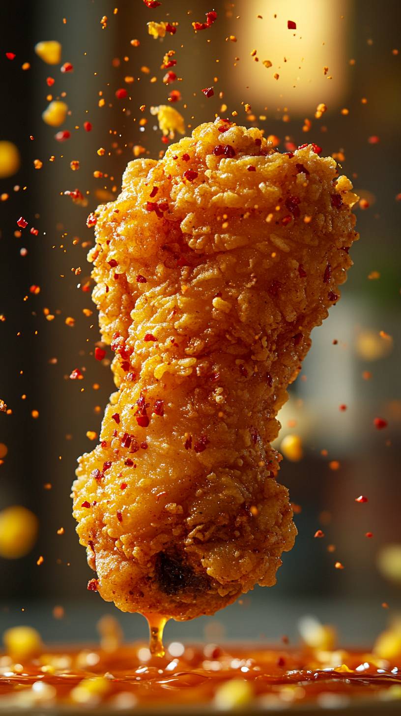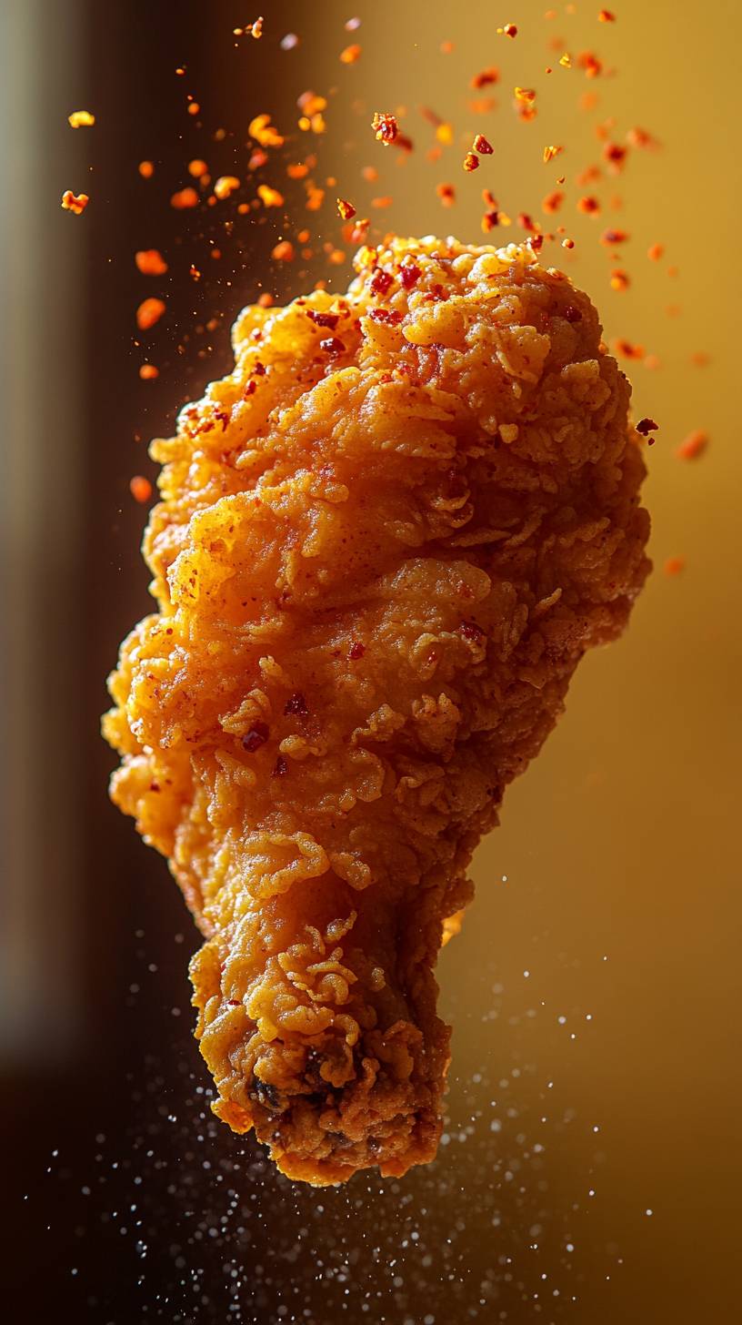 A crispy fried chicken leg in the air, the skin of the crispy fried chicken leg is scattered in the air, yellow and red style, a little chilli powder on the leg, warm yellow background, wide angle, close-up, focal length 55mm, aperture f/1.9, Photo - Realistic Still Life, Softbox Lighting, Tabletop Photography , --ar 9:16 --stylize 750 --v 6.1