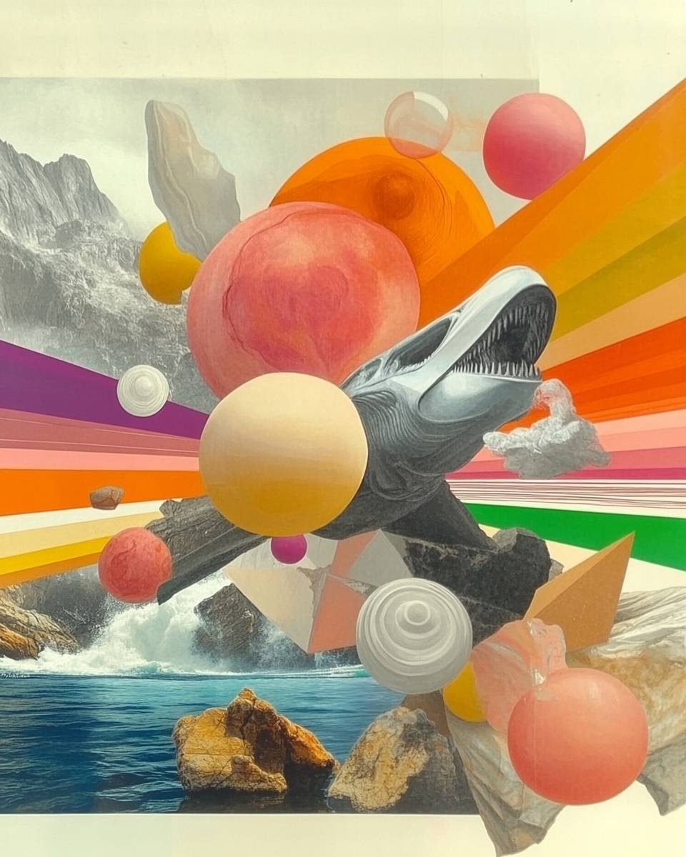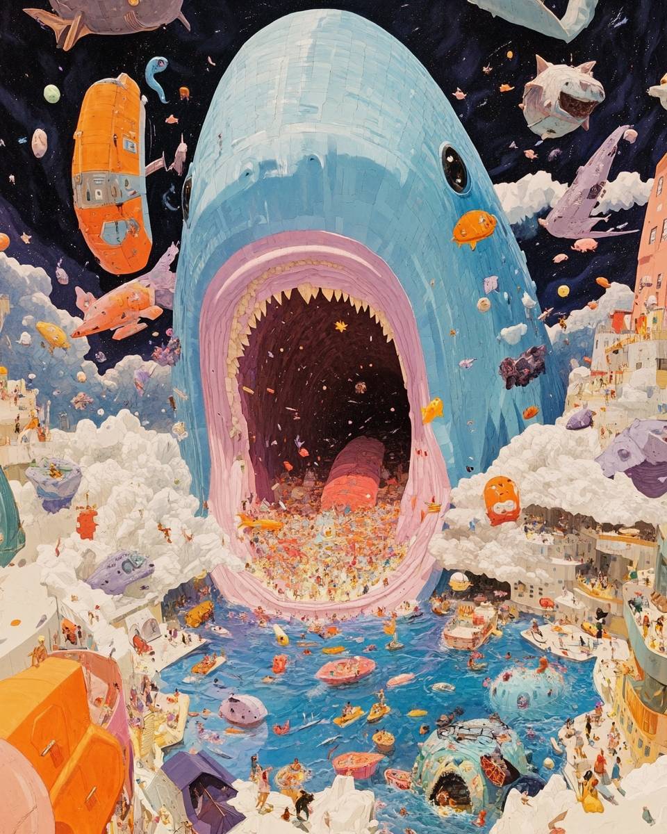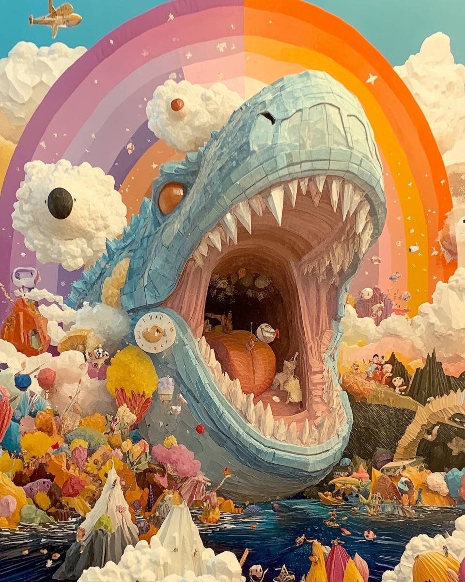 giant biomechanical kaiju invasion hypnagogic maximalism physicsbased paper collage, in the style of suburban flat shading, simplified figures, purple rainbow, studyplace, expert draftsmanship, sculpture, oil pencil sketch --chaos 5 --ar 4:5 --sref 1399560104::1 1690429663::1 2063021222::2 --personalize phjpkaw --stylize 888 --weird 3 --v 6.1