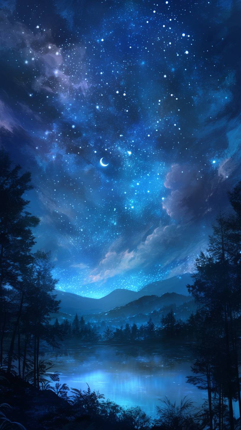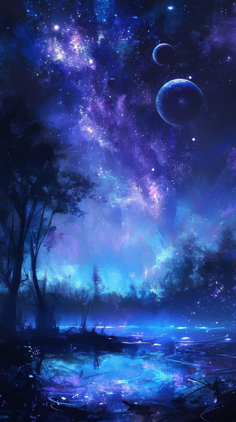 A night sky filled with countless shining stars painted by Van Gogh, with two softly glowing moons floating above. In the distance, a mystical purple aurora shimmers, and below lies a vast, glowing blue lake. The surface of the lake reflects the scenery of the sky, and beyond it, a mysterious forest shrouded in mist is visible. The entire space is enveloped in faint particles of light, creating an atmosphere as if magic is in the air. Oil painting, 4k. --ar 9:16 --style raw --niji 6