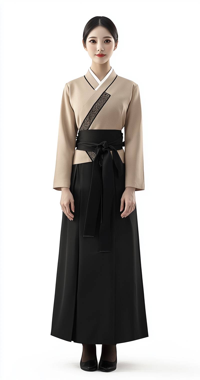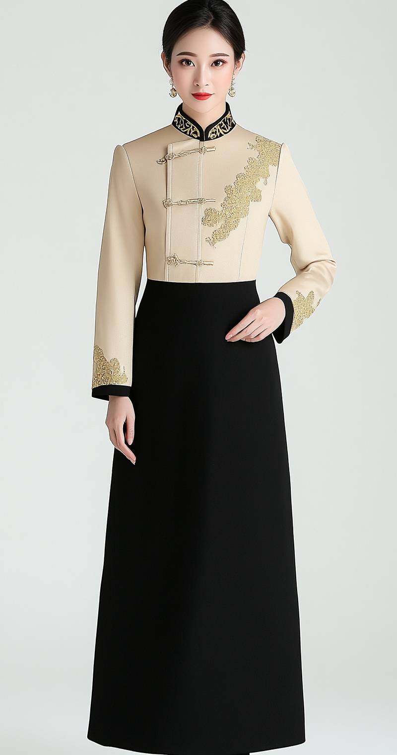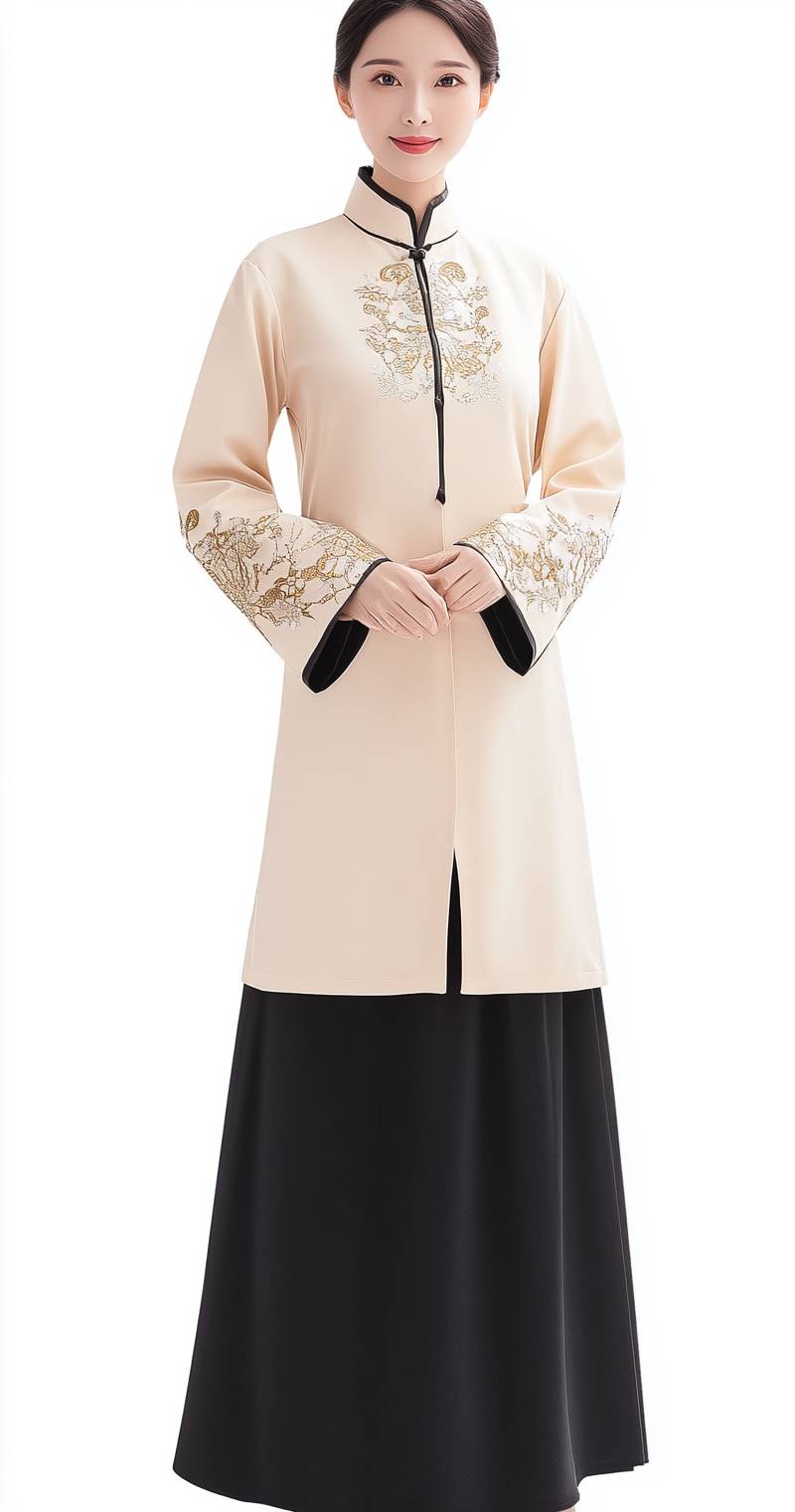 A hotel service staff uniform, with a beige top and black long skirt, has a simple and elegant style. The uniform features light yellow gold and dark gray accents, reminiscent of ancient Chinese . The high-end fashion design sense is evident in the front view of the full-body uniform, set against a white background. --ar 67:128 --style raw --stylize 50 --v 6.1