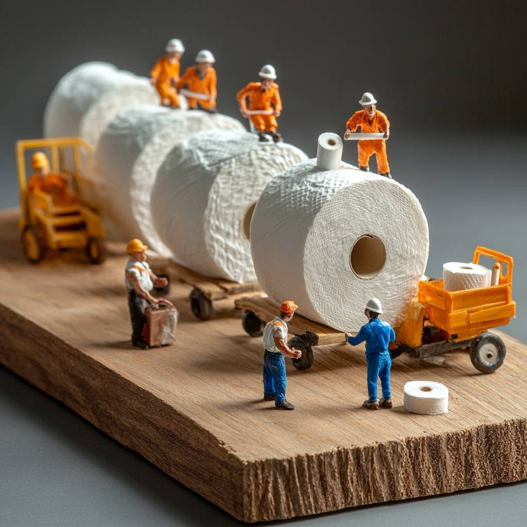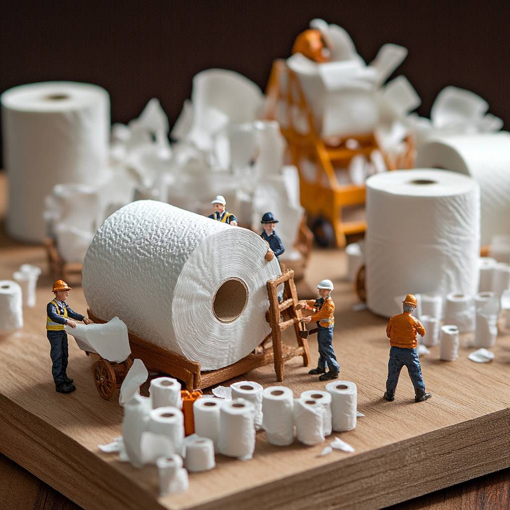 Auf einem Holztisch sind mehrere kleine Menschen in Arbeitsuniformen beschäftigt, riesige Rollen Toilettepapier aufzurollen. Sie verwenden verschiedene clevere Werkzeuge, wie Mini-Handwagen und selbstgemachte Rollmaschinen.