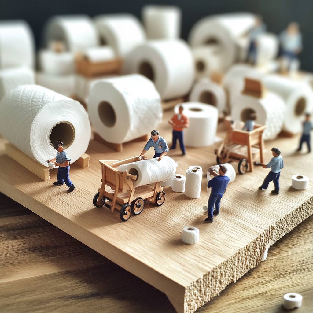 On a wooden board, several little people in work uniforms are busily rolling up huge rolls of toilet paper. They use various clever tools, like mini hand carts and homemade rolling machines, --ar 1:1 --v 6.1