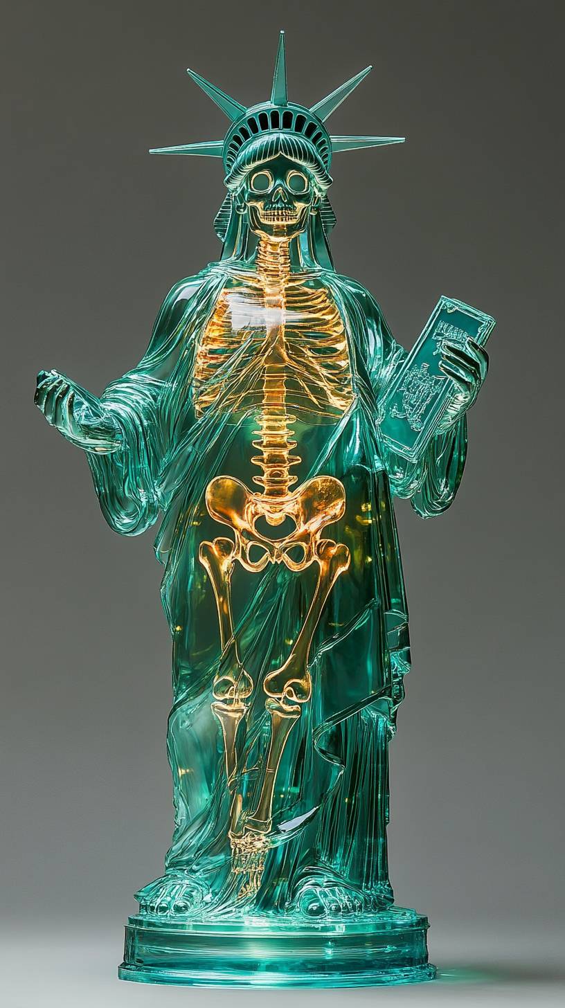 Freiheitsstatue in New York mit transparenter Haut und leuchtendem Skelett