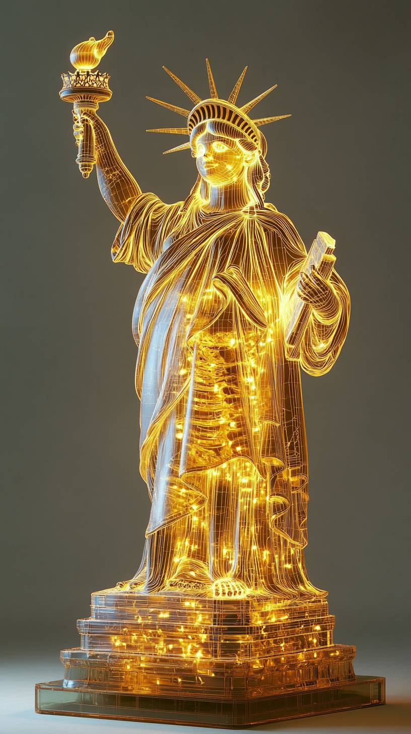 Full shot of real statue in the NYC [Statue of Liberty] with transparent skin, chibi character and chubby, glowing [gold] neon skeleton visible through translucent skin, studio lighting, made of glossy materials, [gray] background, shot on hasselblad x1d --ar 9:16 --stylize 250 --v 6.1